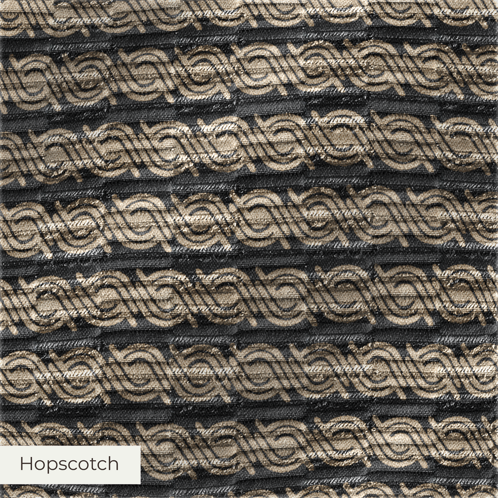 A bold, playful upholstery fabric with raised rectangular accents and subtle sheen. Hopscotch offers a modern architectural feel. Its tactile surface, durability, and design selection make it ideal for statement home decor pieces.