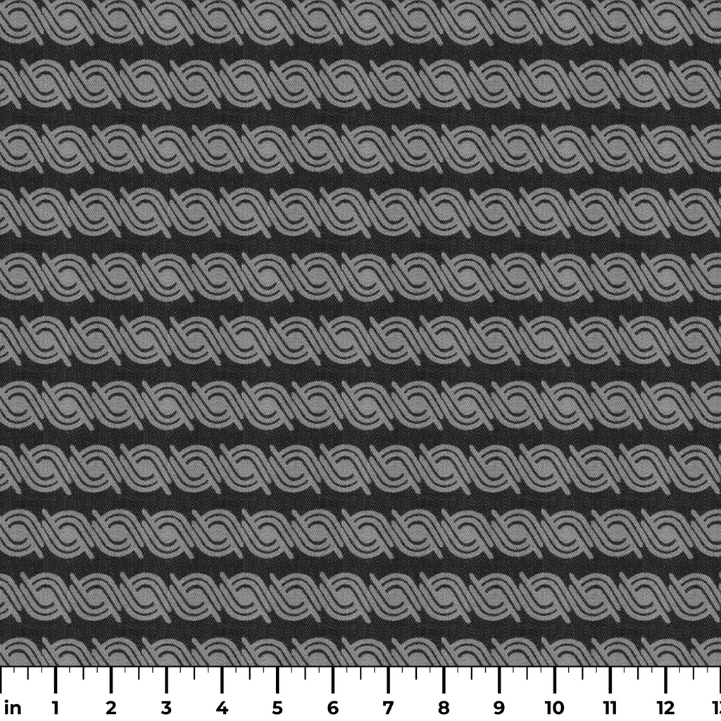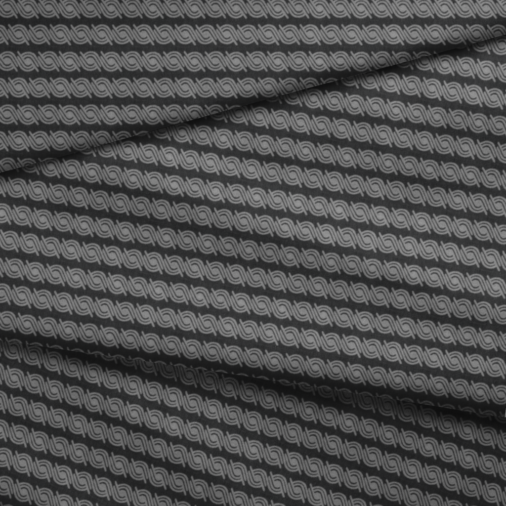 Elegant black and grey swirling pattern fabric showcases a timeless, geometric design with flowing curves. Perfect for contemporary home decor or upholstery with its sophisticated, textured appearance.