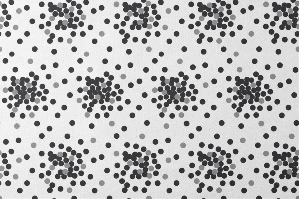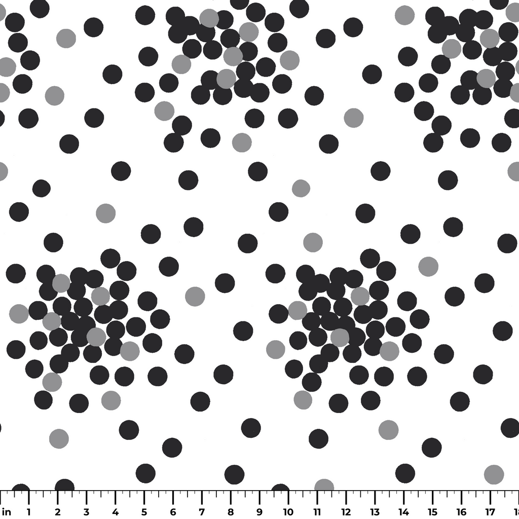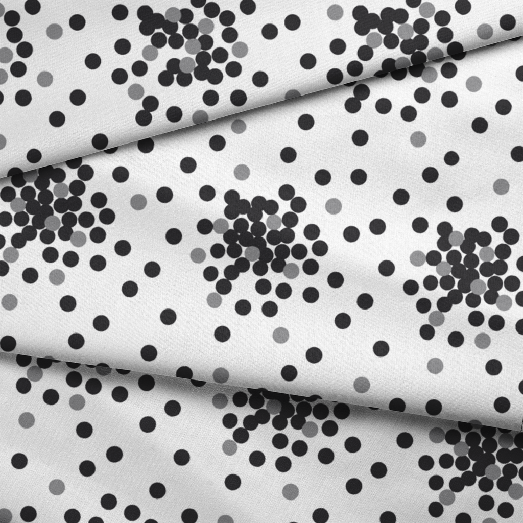 Sophisticated polka dot pattern in black and gray scattered on white, with clusters creating visual interest. Modern geometric design perfect for contemporary home decor or stylish apparel.