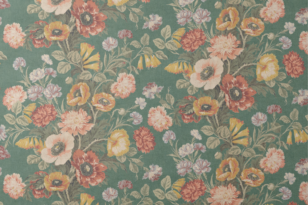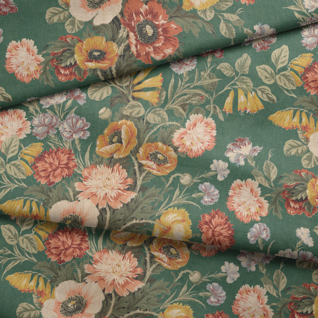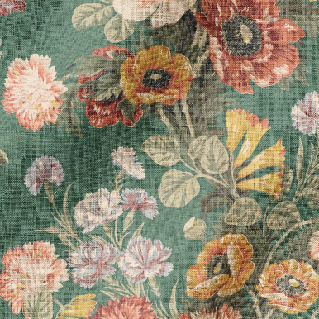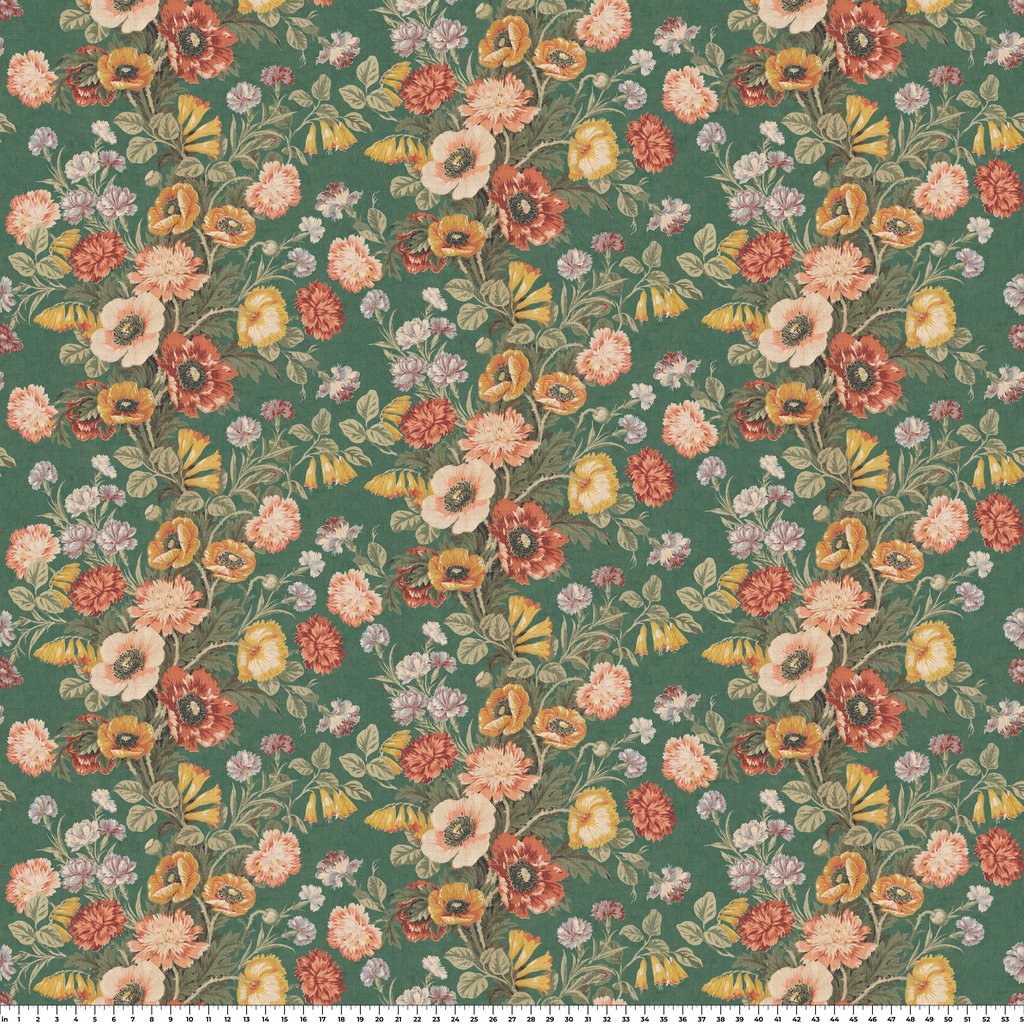 This lush vintage floral pattern showcases an elegant array of blooms in coral, cream, and yellow on a rich green background, perfect for creating a timeless botanical aesthetic in any space.