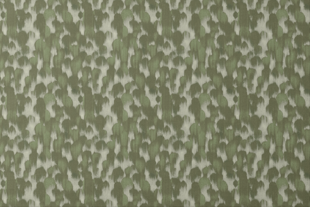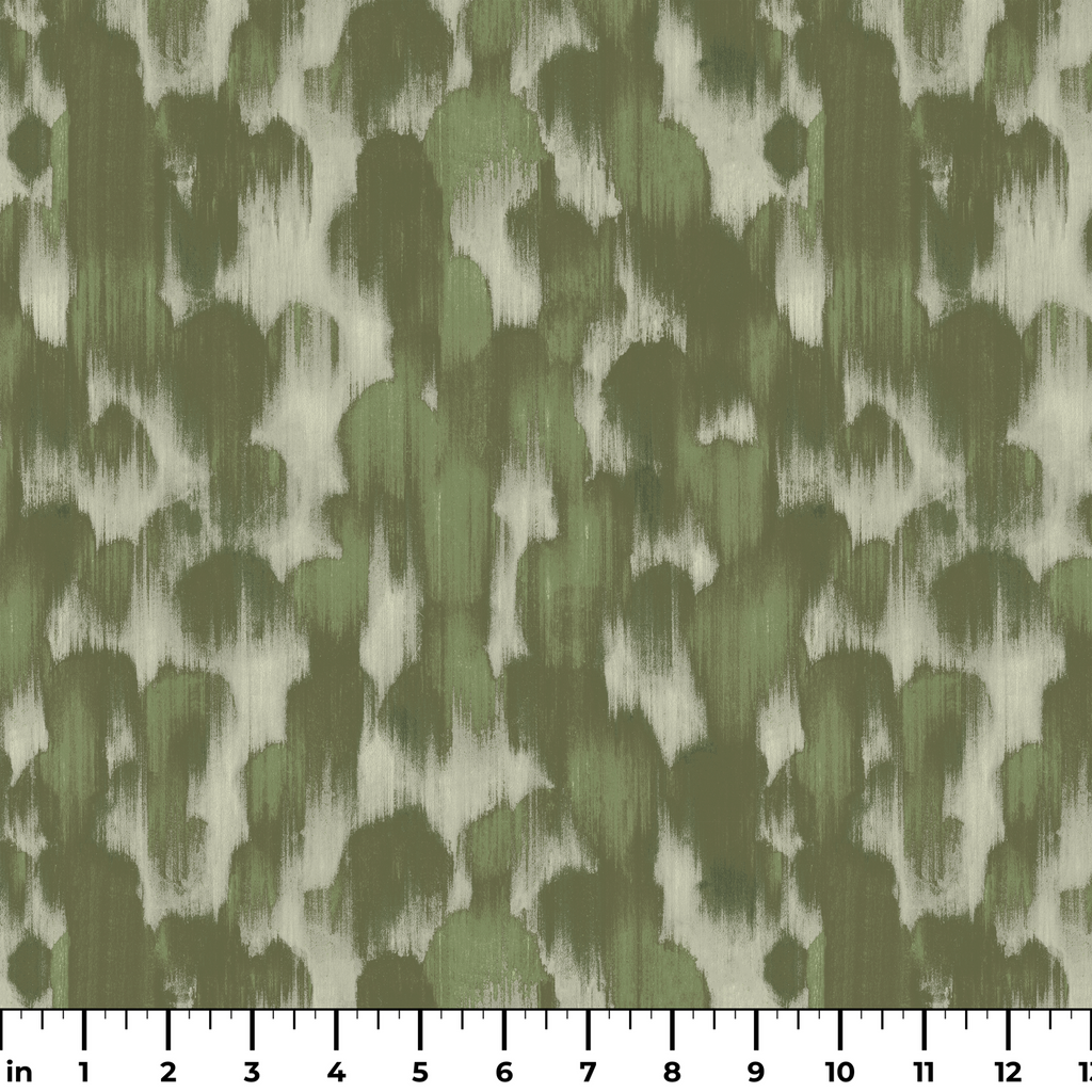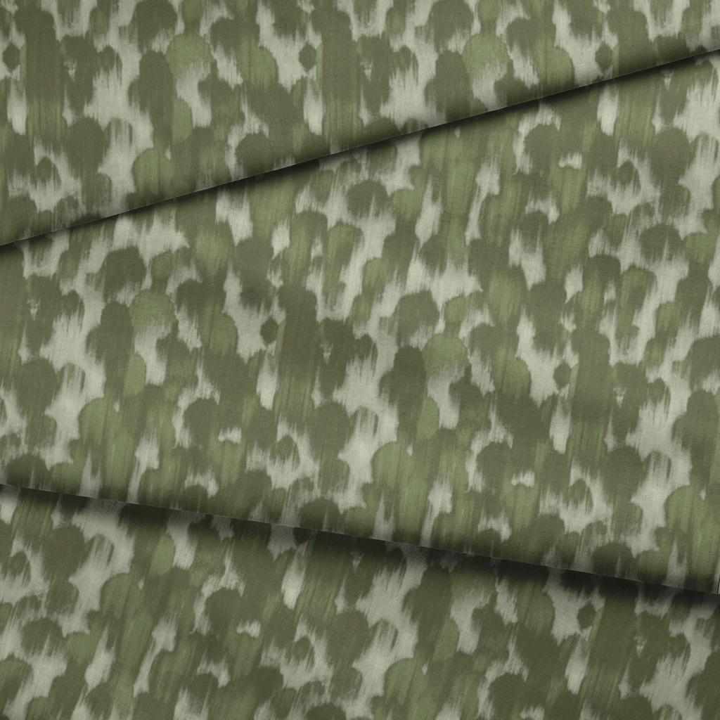 This abstract olive green and taupe camouflage textile features a brushstroke pattern with watercolor-like blending, perfect for modern interior design or military-inspired fashion.