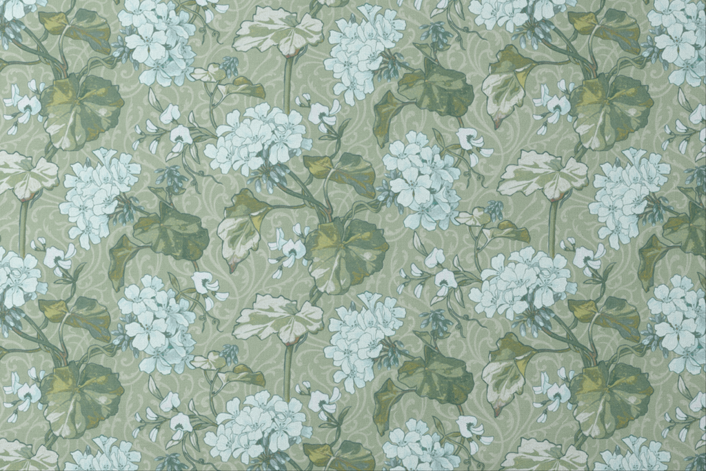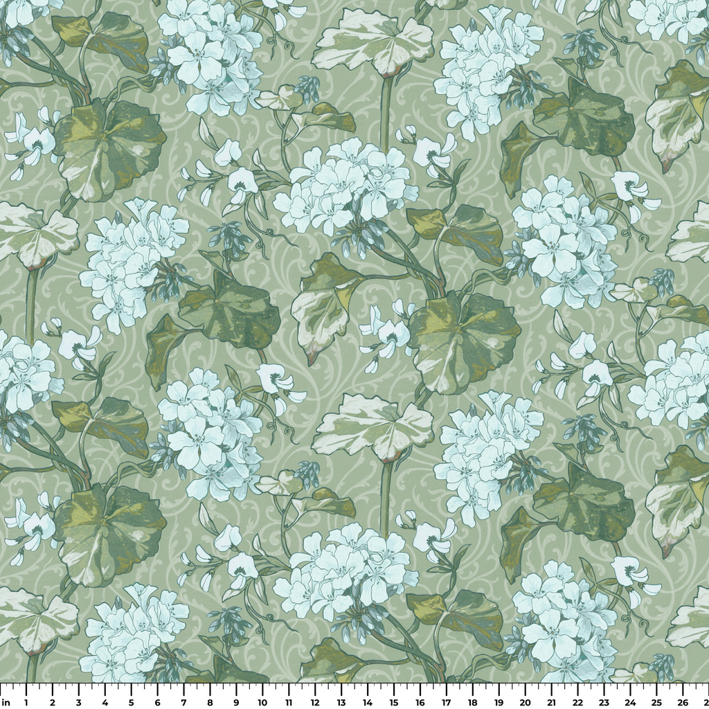 Delicate vintage floral pattern with pale blue geranium blooms and green leaves on a soft green background.