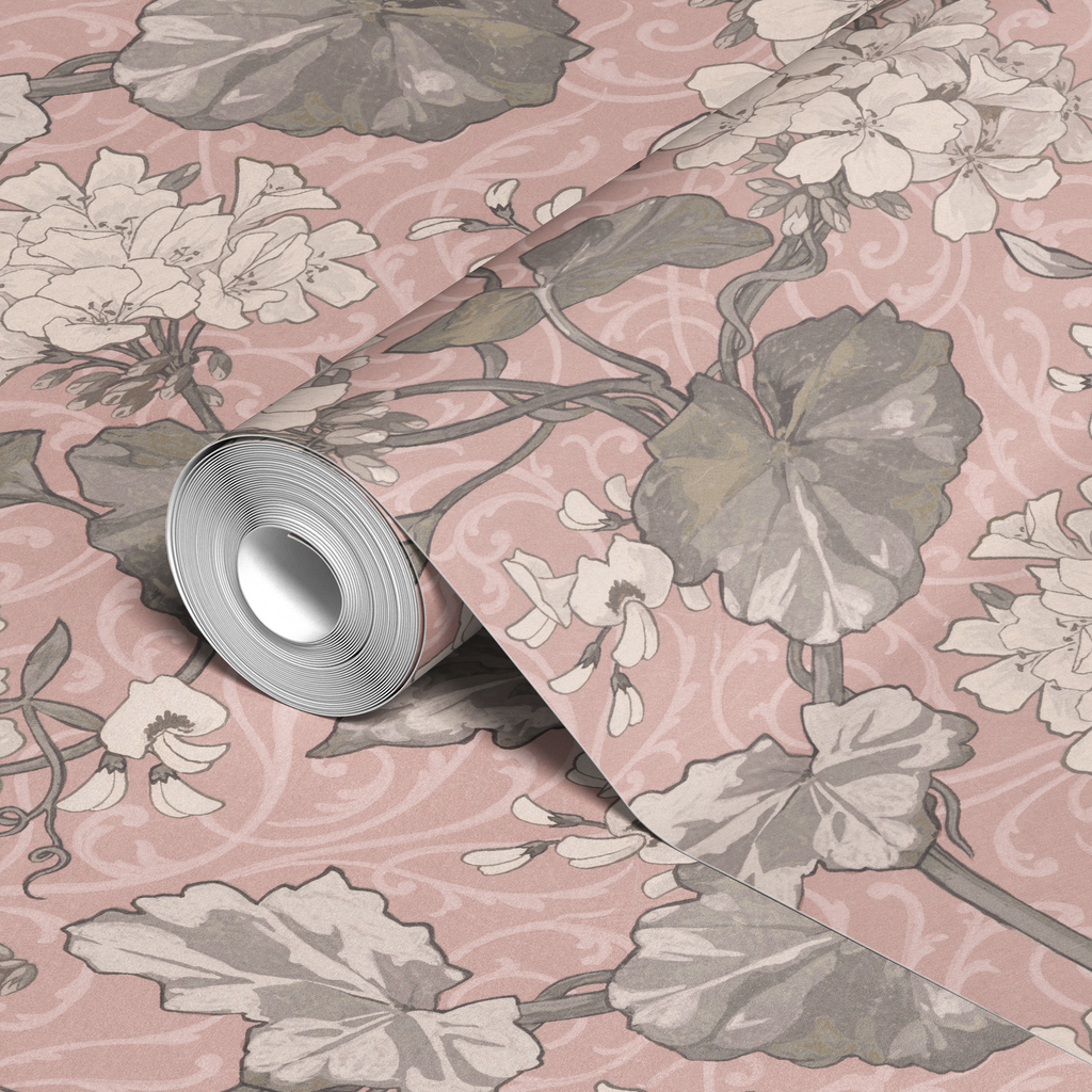 Elegant vintage floral pattern in soft pink and gray tones, featuring delicate white blossoms and lush foliage with a romantic, heritage-inspired aesthetic perfect for sophisticated home decor.