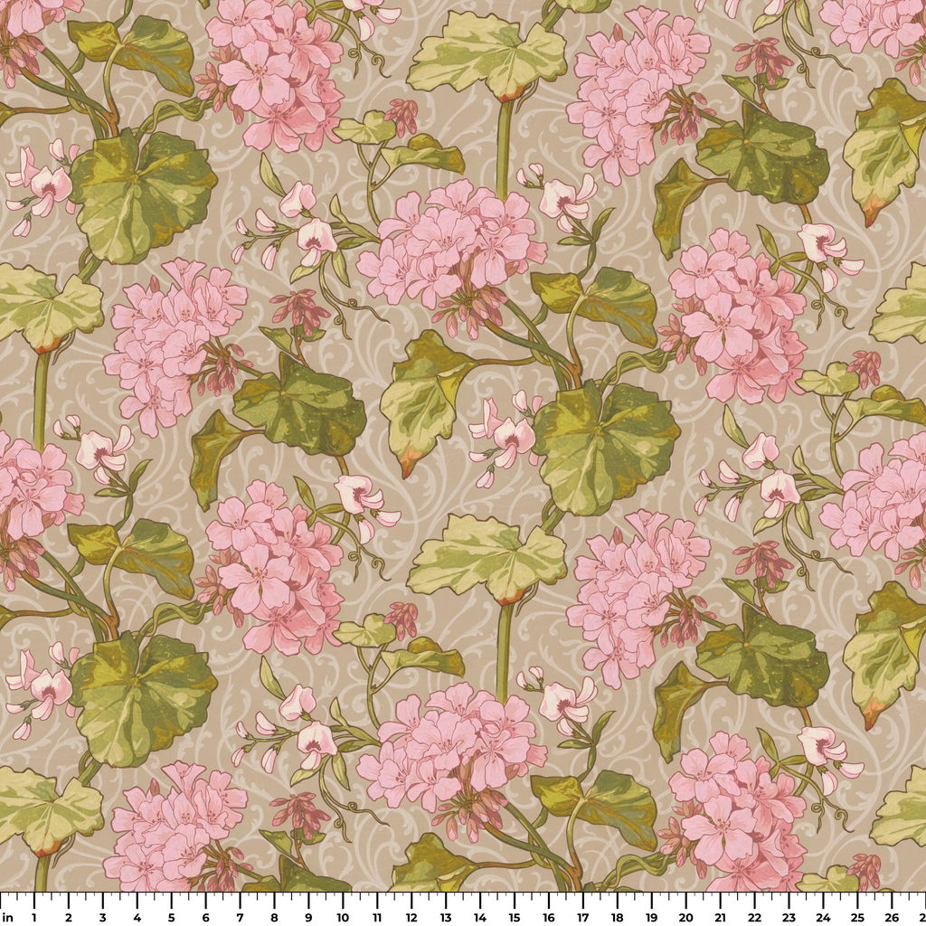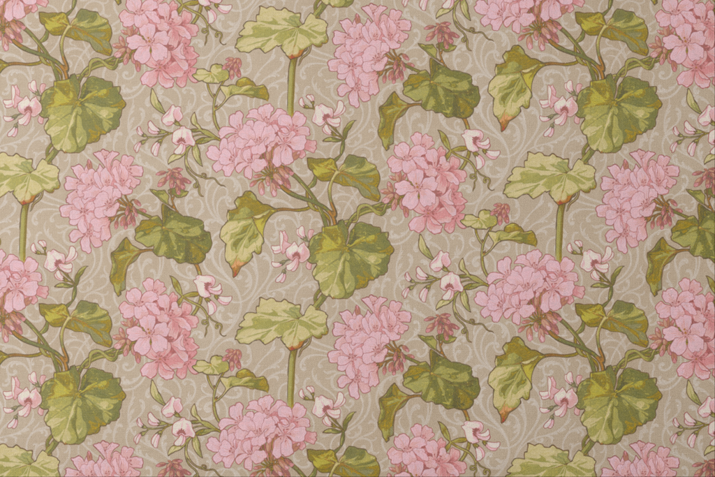Delicate vintage floral pattern with pink geranium blooms and green leaves on a soft neutral background.