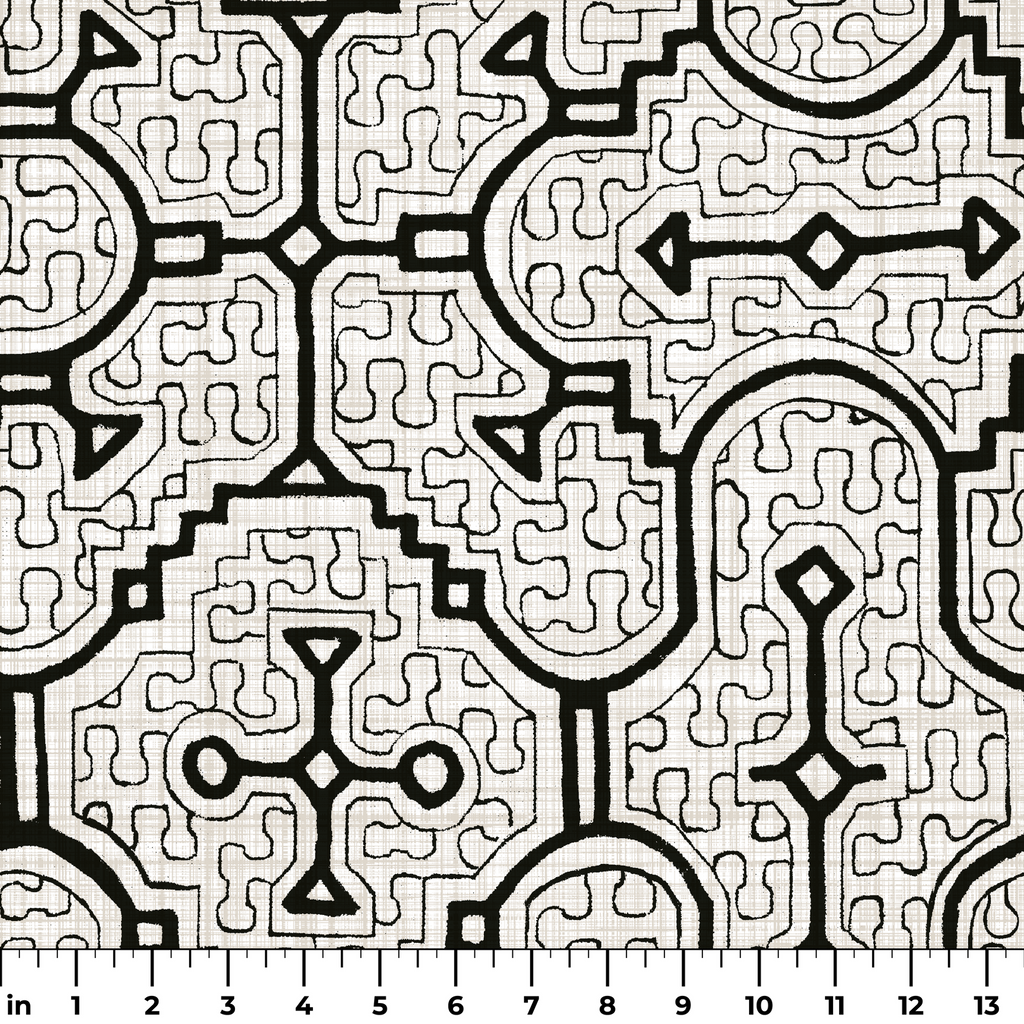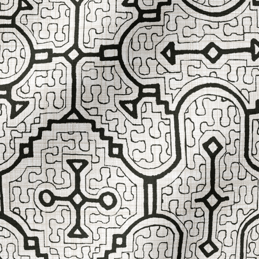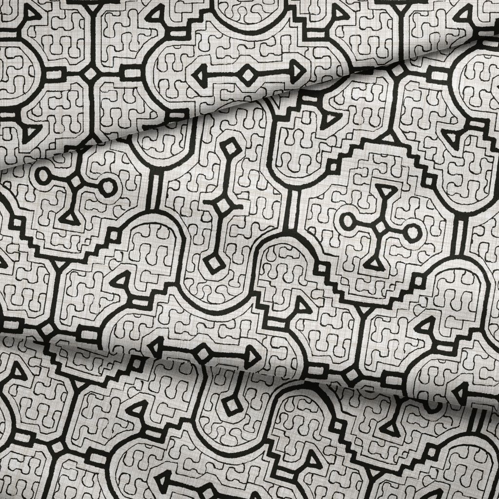 Intricate black and white geometric maze pattern featuring connecting pathways, curved lines and abstract shapes. This contemporary design combines organic forms with structured elements for a visually complex texture.