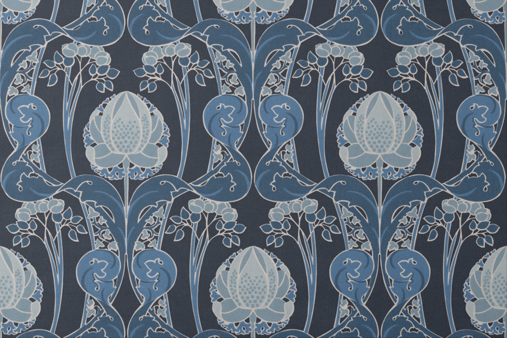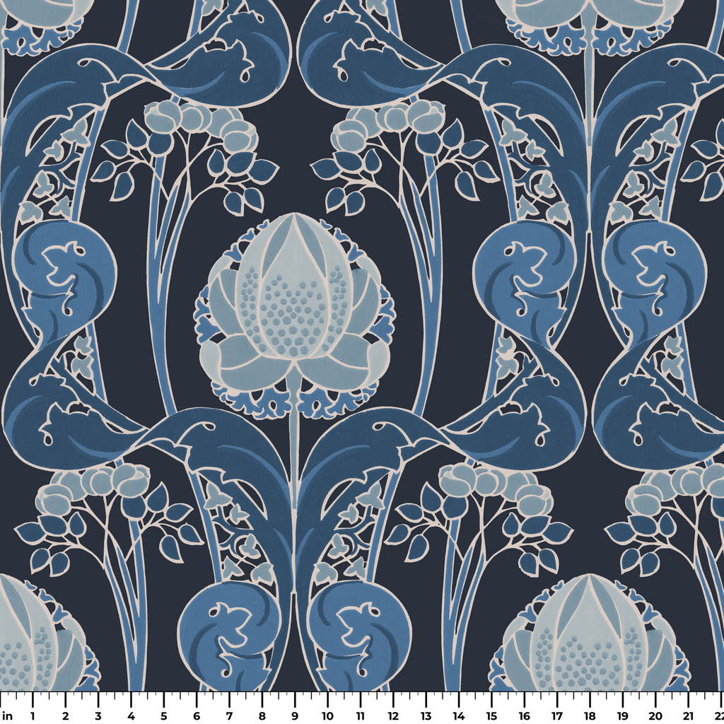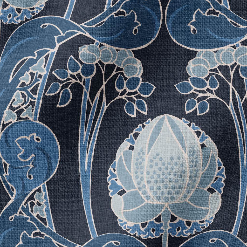 Elegant Art Nouveau floral design in deep indigo and navy blue tones featuring stylized botanical motifs and flowing curves.