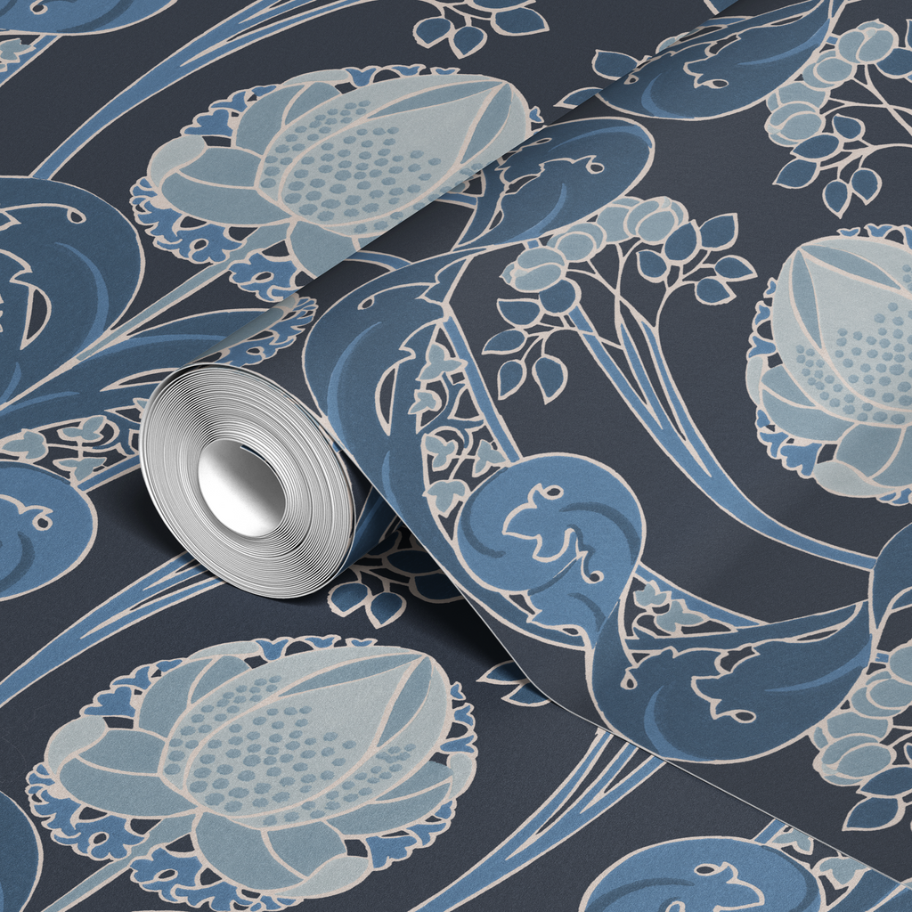Elegant Art Nouveau floral pattern featuring stylized lotus blooms and curving stems in calming shades of blue against a navy background, perfect for heritage-inspired home decor.