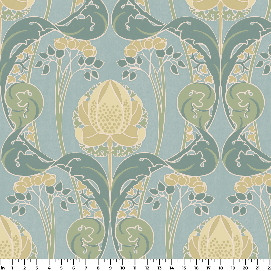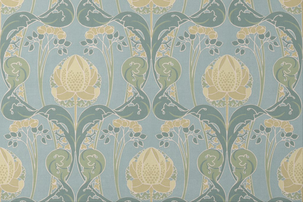 Elegant Art Nouveau floral design in soft blue and yellow tones featuring stylized botanical motifs and flowing curves.