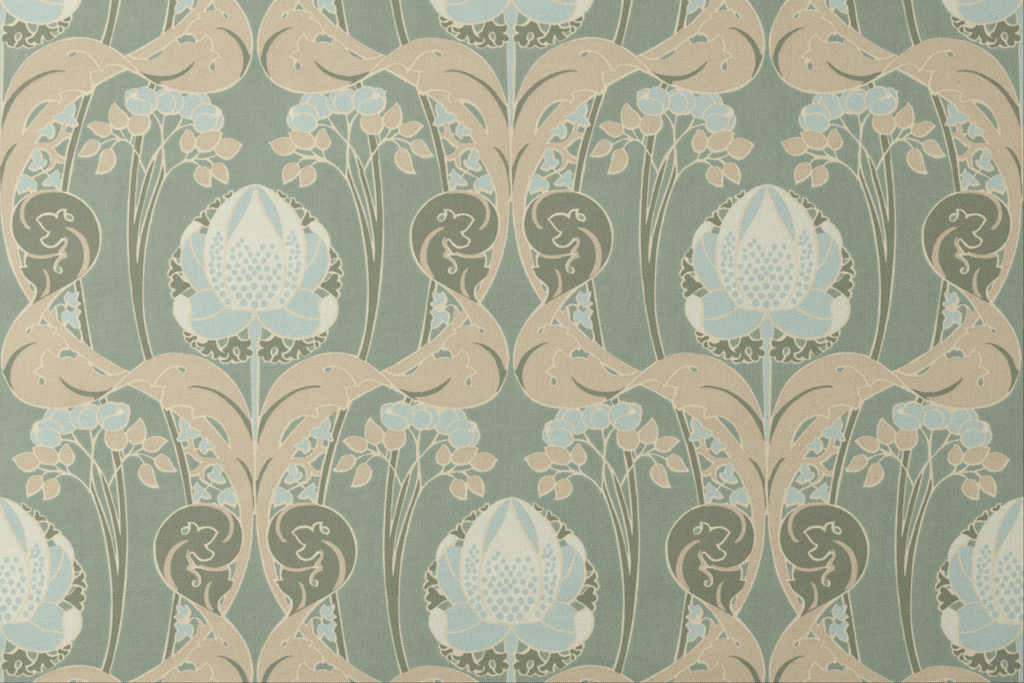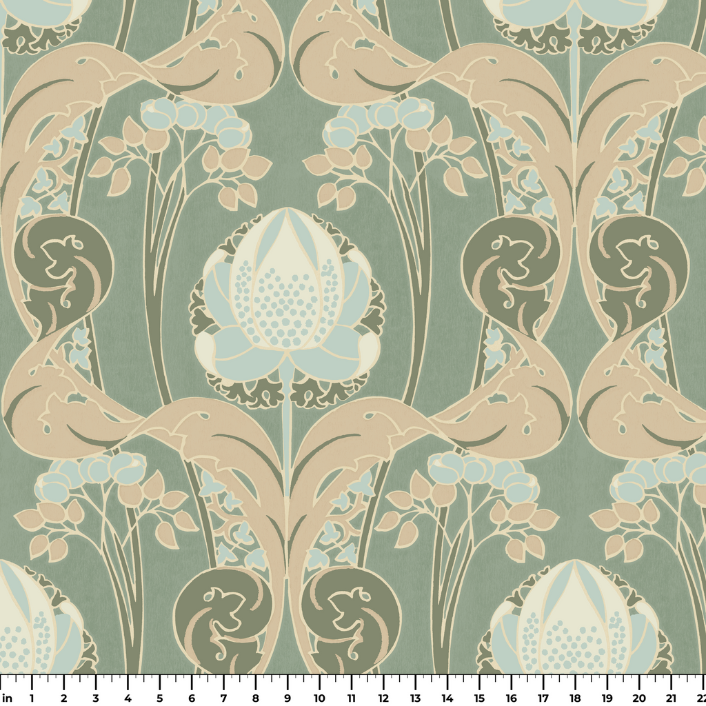 Elegant Art Nouveau floral design in soft sage and beige tones featuring stylized botanical motifs and flowing curves.
