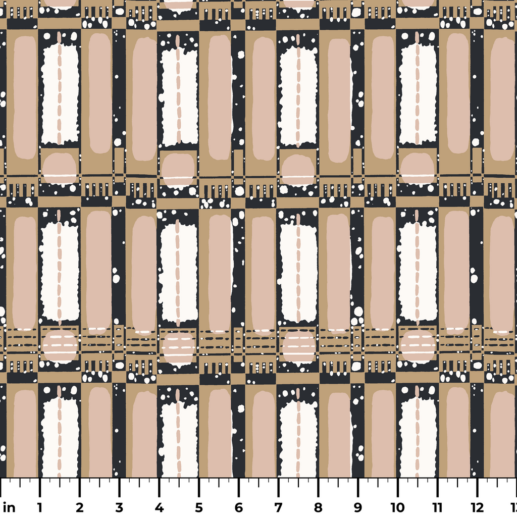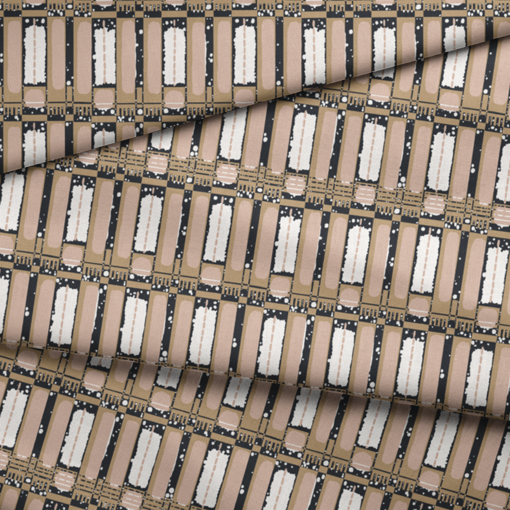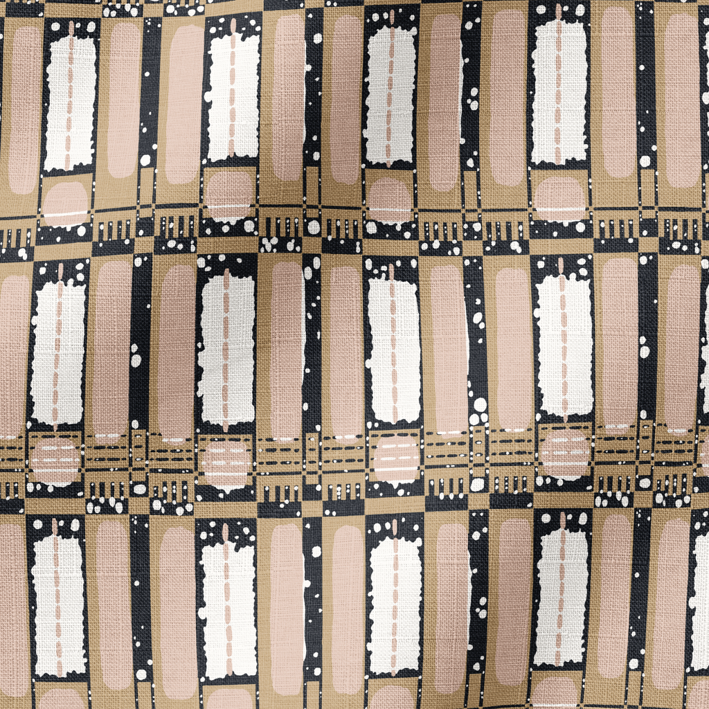 Vintage-inspired geometric design featuring rustic brown, gold, and cream rectangular panels with a weathered, industrial appearance. Perfect for mid-century modern aesthetics.
