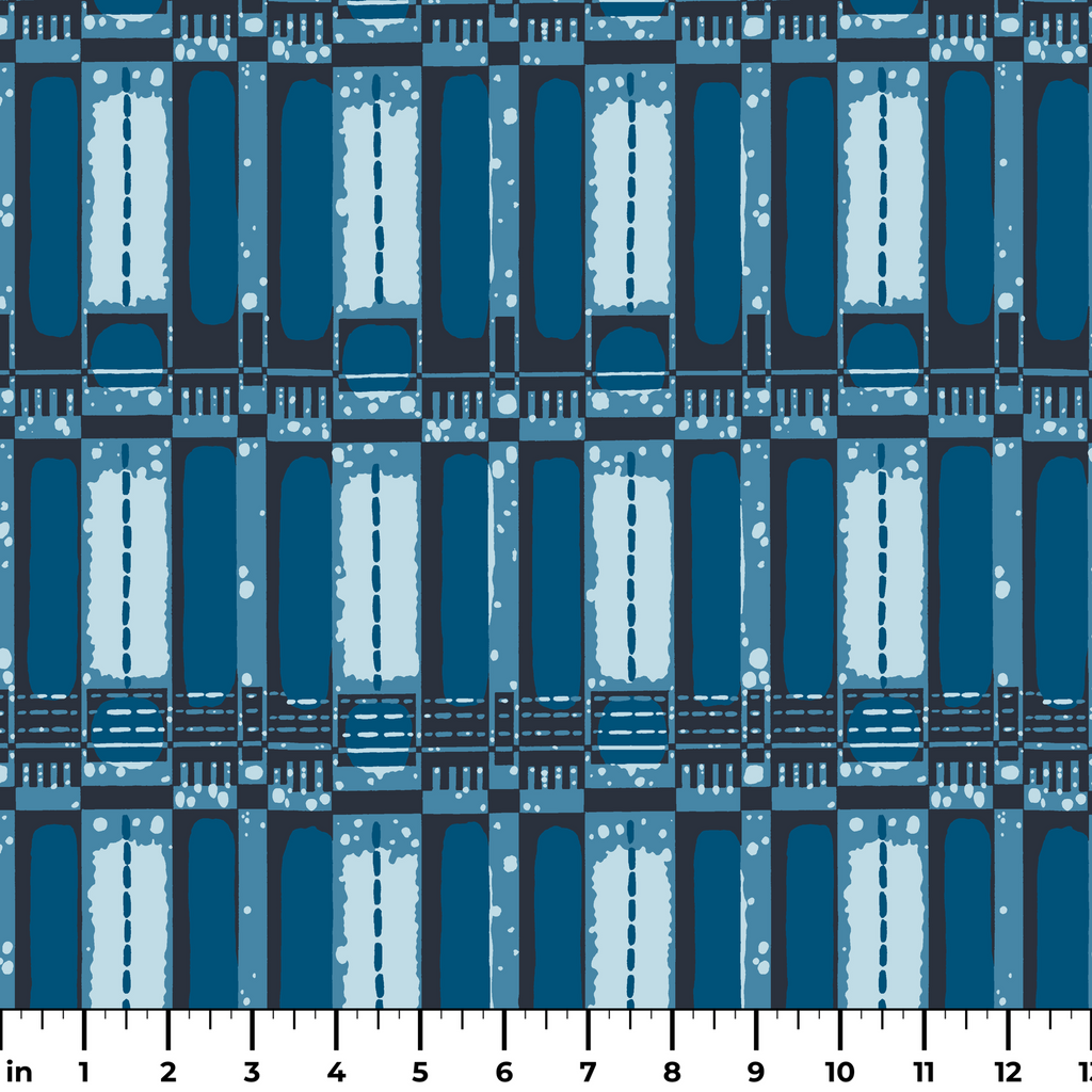 Vintage-inspired geometric design featuring rustic brown, royal blue, and blue-cream rectangular panels with a weathered, industrial appearance. Perfect for mid-century modern aesthetics.