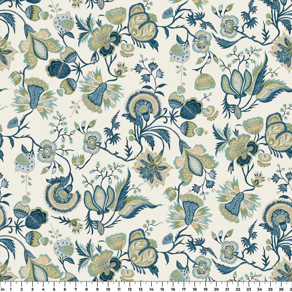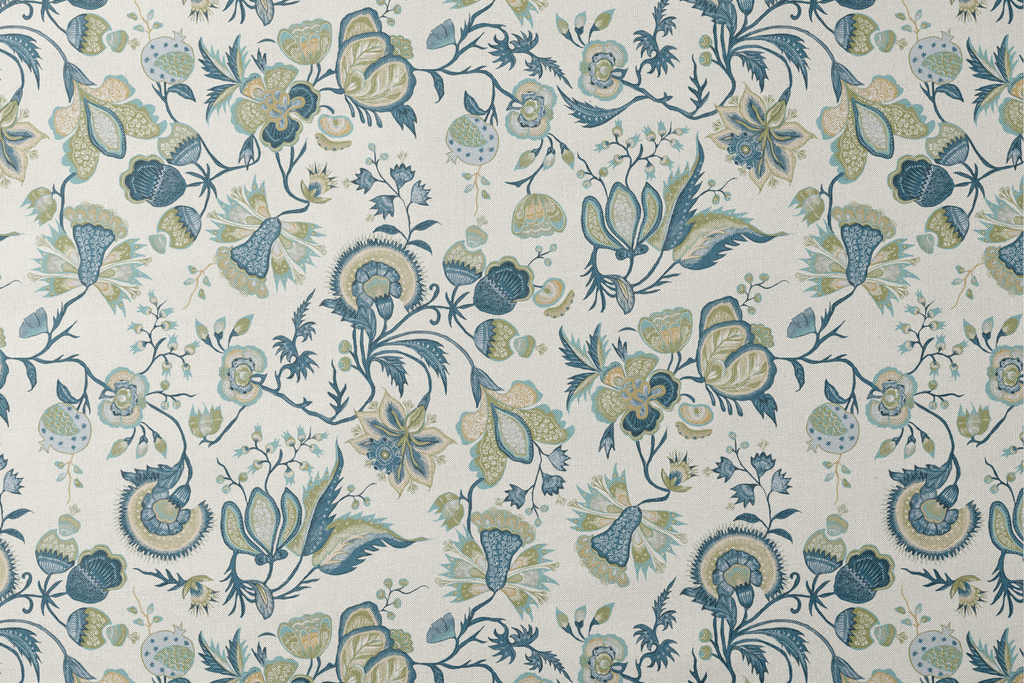 Elegant vintage floral pattern featuring intricate paisley motifs in blue and green on an off white background, perfect for a classic room style with a timeless botanical appeal.