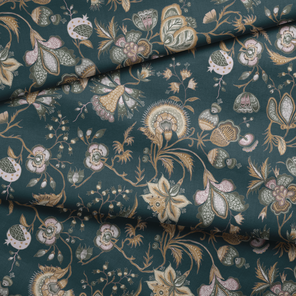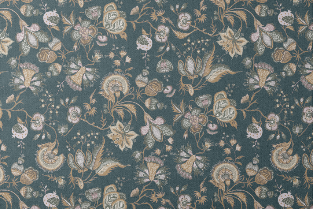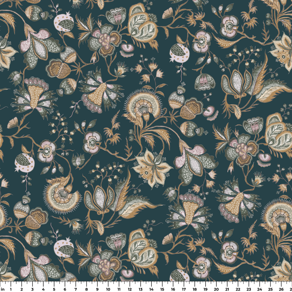 Elegant vintage floral pattern featuring intricate paisley motifs in neutral tones on a deep blue background, perfect for a classic room style with a timeless botanical appeal.