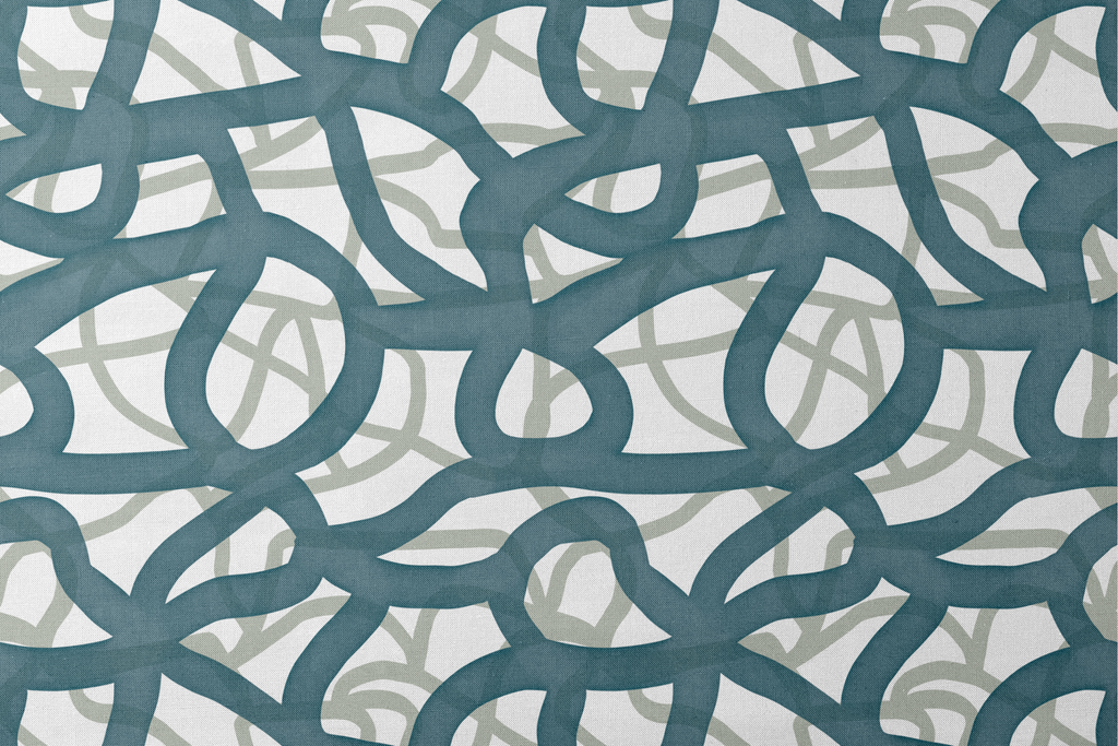 Contemporary geometric pattern featuring interlacing dark teal and soft gray swirls creating a dynamic, abstract design. Perfect for modern home decor with its sophisticated color palette and bold artistic style.
