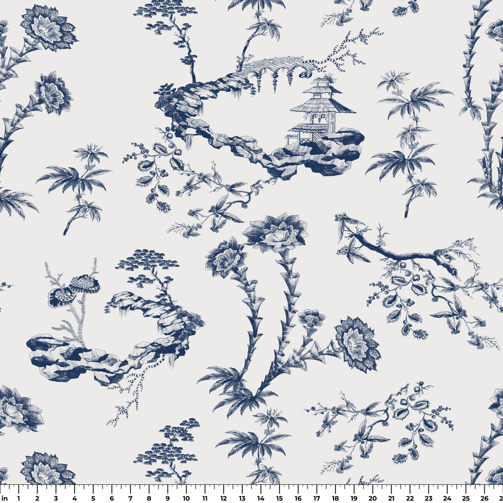 Transform your space with this elegant Asian-inspired toile pattern in blue on cream. Featuring tropical palm trees, pagodas, and delicate scenery for a classic cultural style.