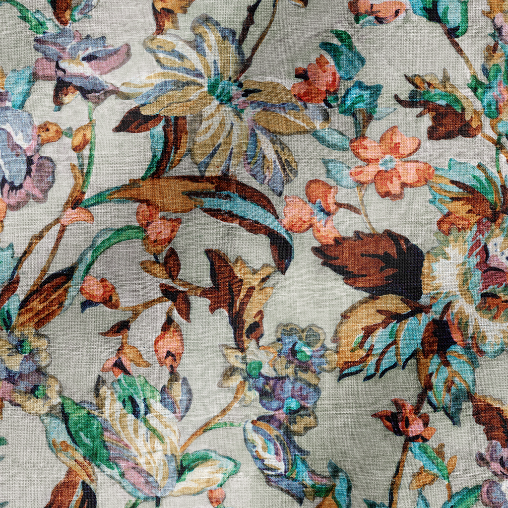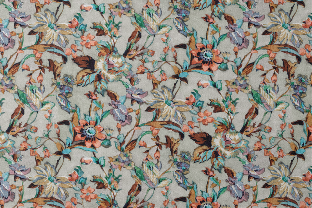 Delicate vintage floral pattern featuring painted blooms in coral, blue, and sage on a light gray background.