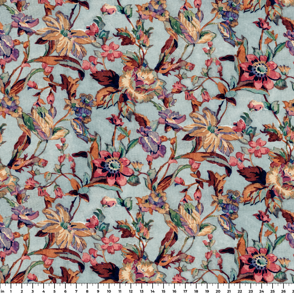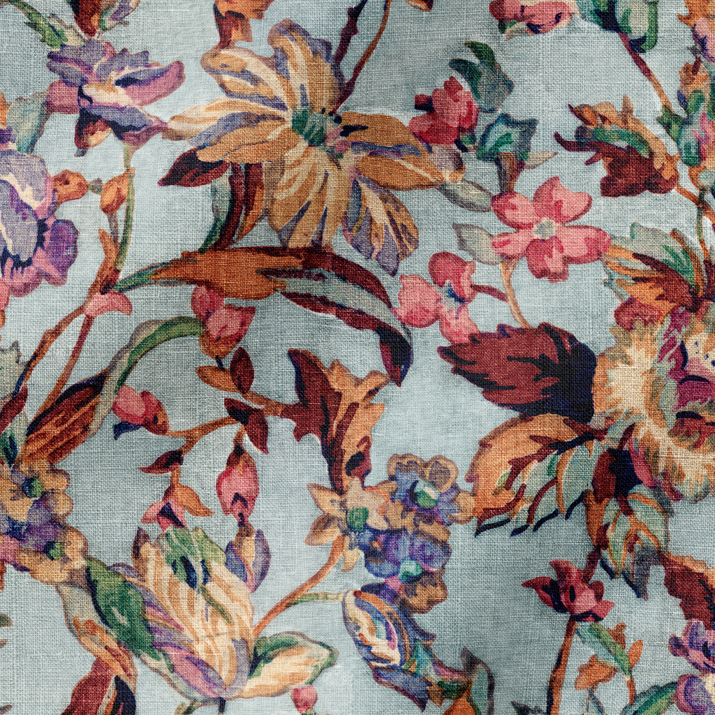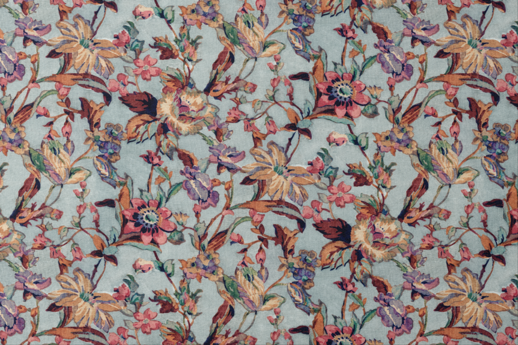 Delicate vintage floral pattern featuring painted blooms in coral, red, and sage on a light blue background.