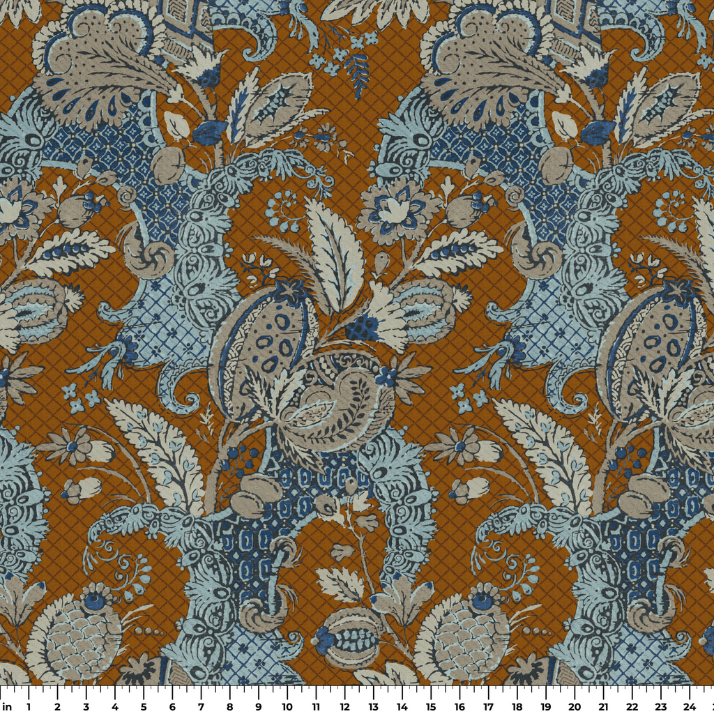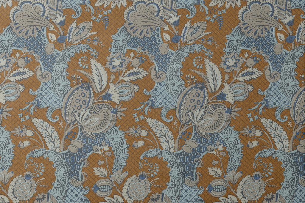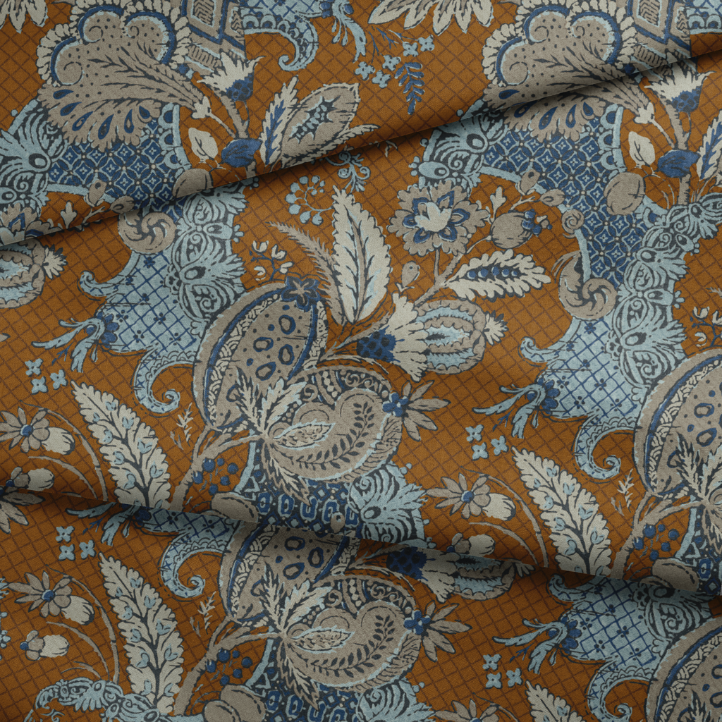 Elegant paisley damask wallpaper in blue and golden brown tones creates a sophisticated vintage look with intricate floral motifs and scrolling patterns. Perfect for adding texture and a charming touch to any room.