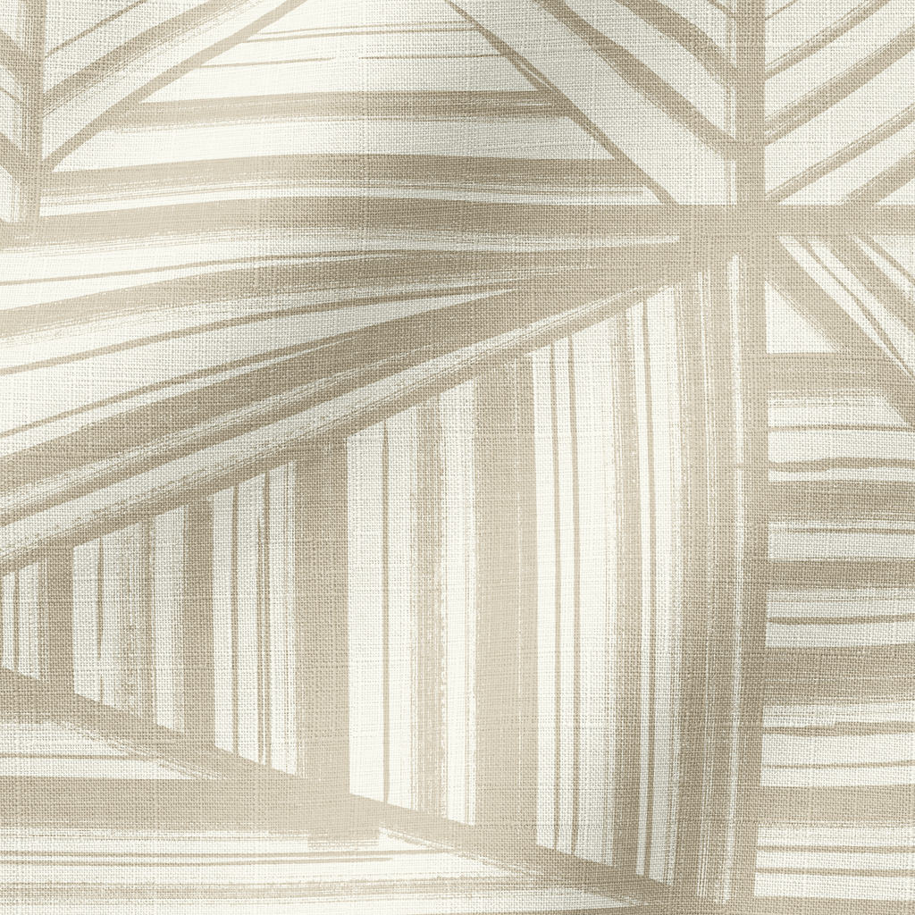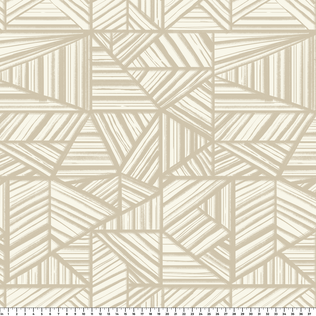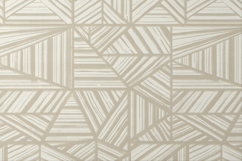Modern geometric pattern in neutral beige and cream featuring stylized triangular shapes and linear details.