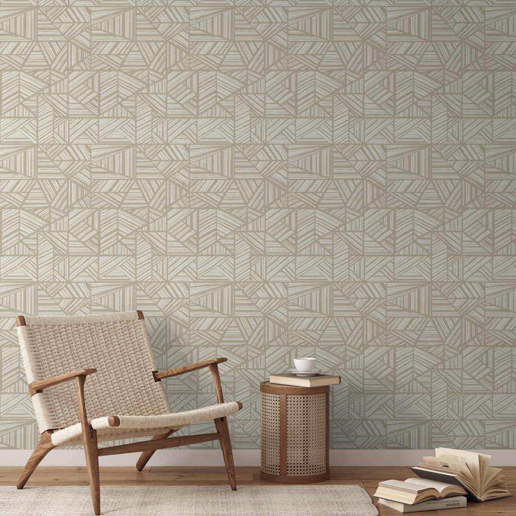 Modern geometric pattern in neutral beige and cream featuring stylized triangular shapes and linear details.