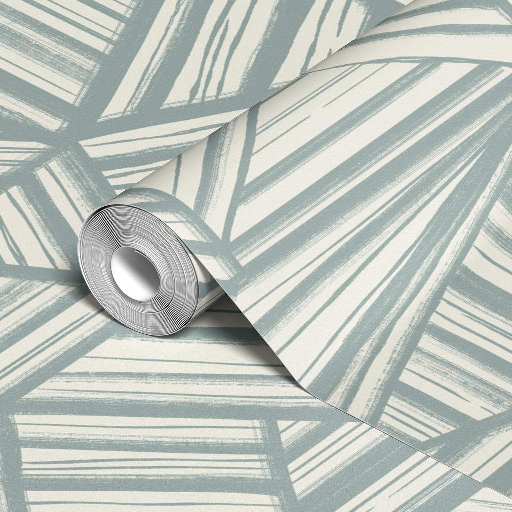 Modern geometric pattern in neutral blue and cream featuring stylized triangular shapes and linear details.