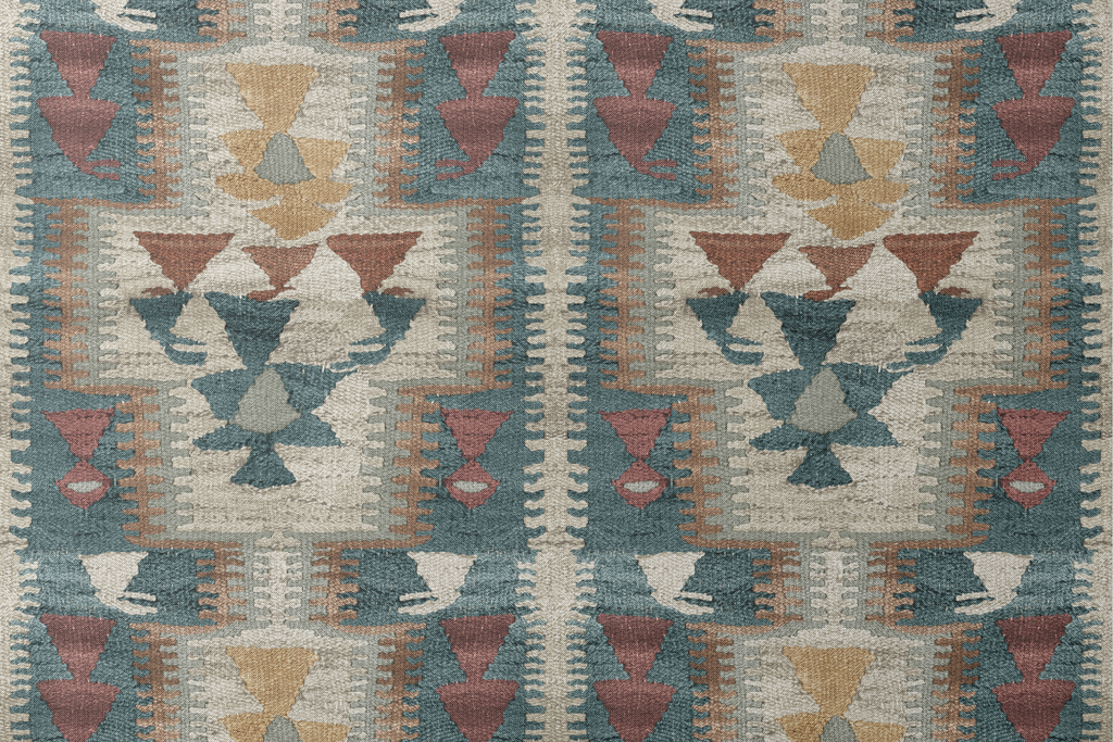 Traditional geometric textile with burgundy, teal, and gold triangular patterns arranged in symmetrical rows, ideal for a unique touch to any space.