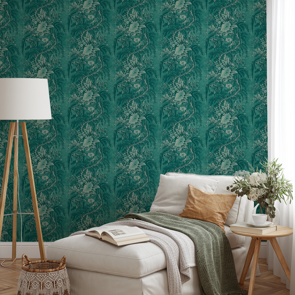 Elegant teal toile pattern featuring intricate pastoral scenes with swirling botanical elements, creating a classic traditional design in a sophisticated monochromatic palette.