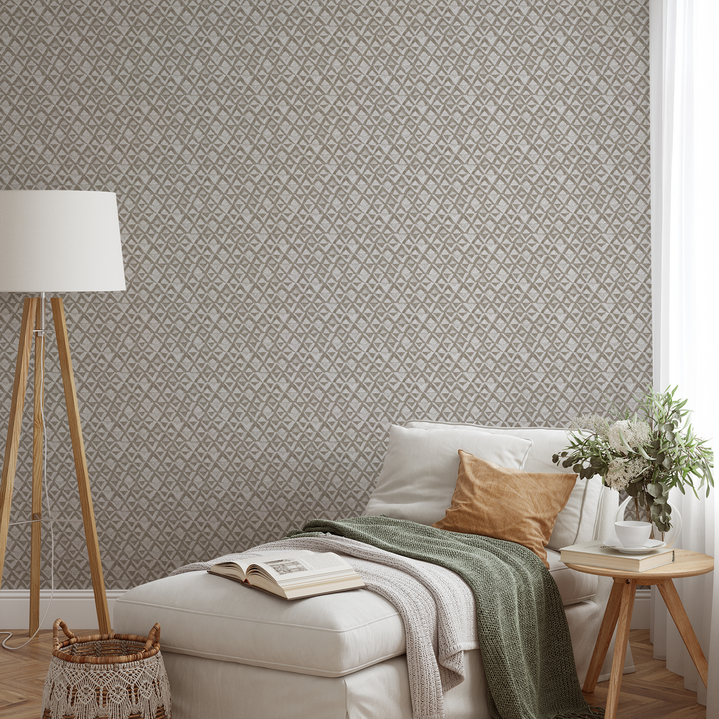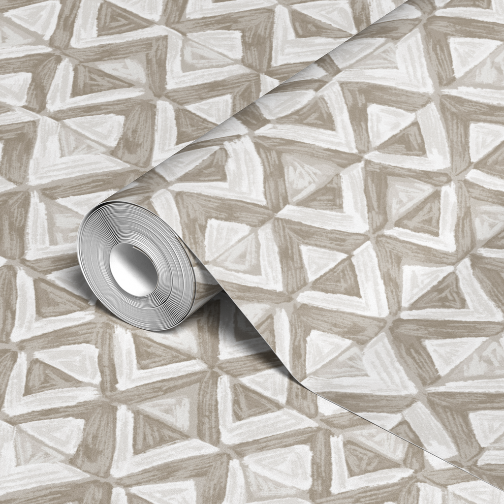 This sophisticated geometric pattern features taupe triangles arranged in a repeating tessellation design, creating an elegant texture with subtle shading and a contemporary minimalist aesthetic.