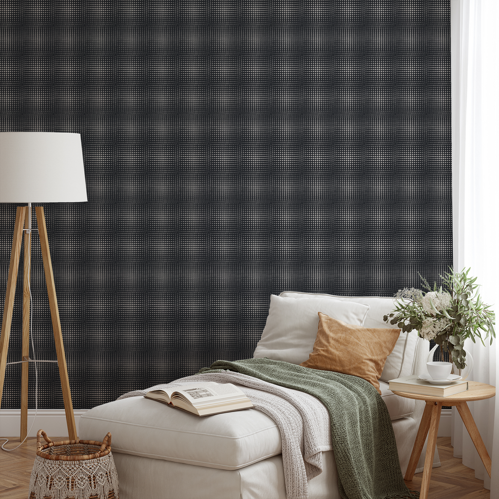 Modern geometric pattern in black and white featuring a grid of small squares that creates an optical illusion effect with varying density toward the center.