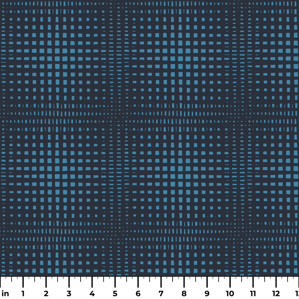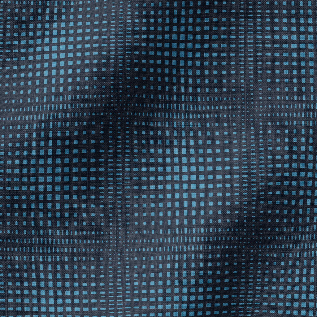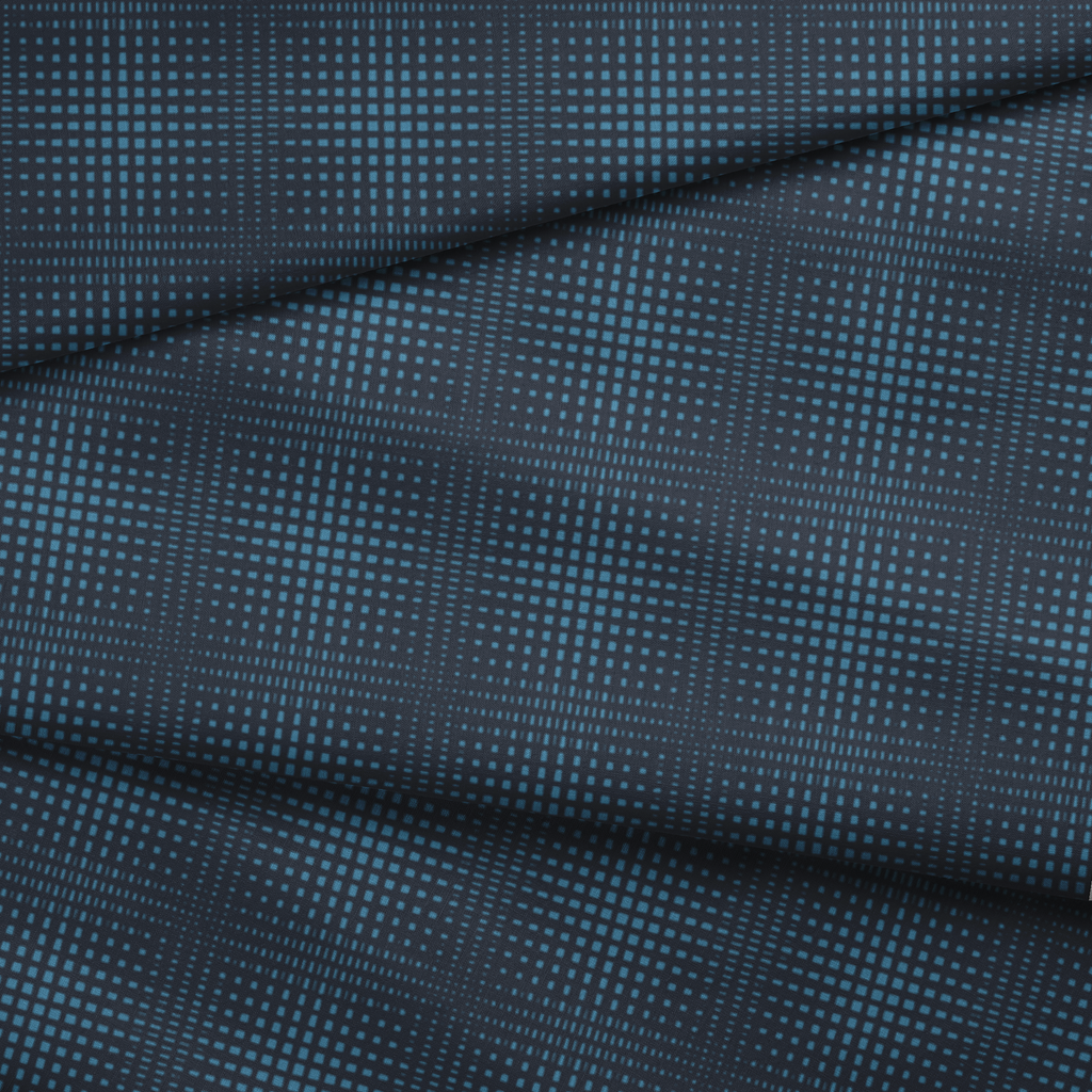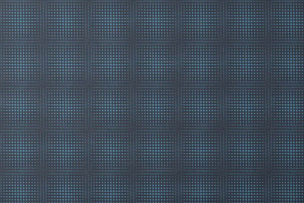 This design is an abstract geometric pattern in black and blue featuring a grid of small blue squares on a dark background, creating a modern minimalist design with optical depth effect.