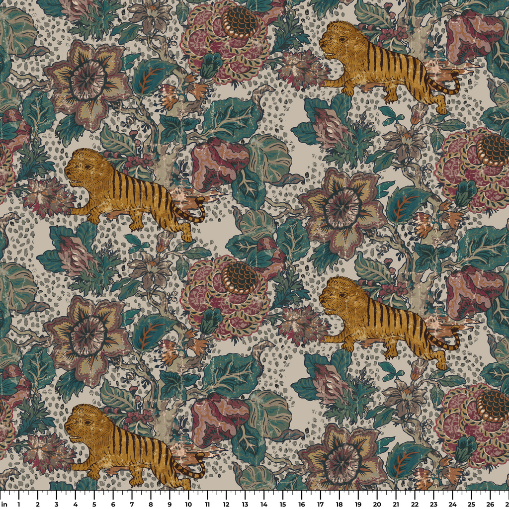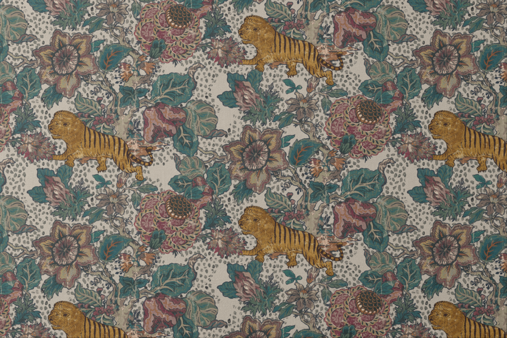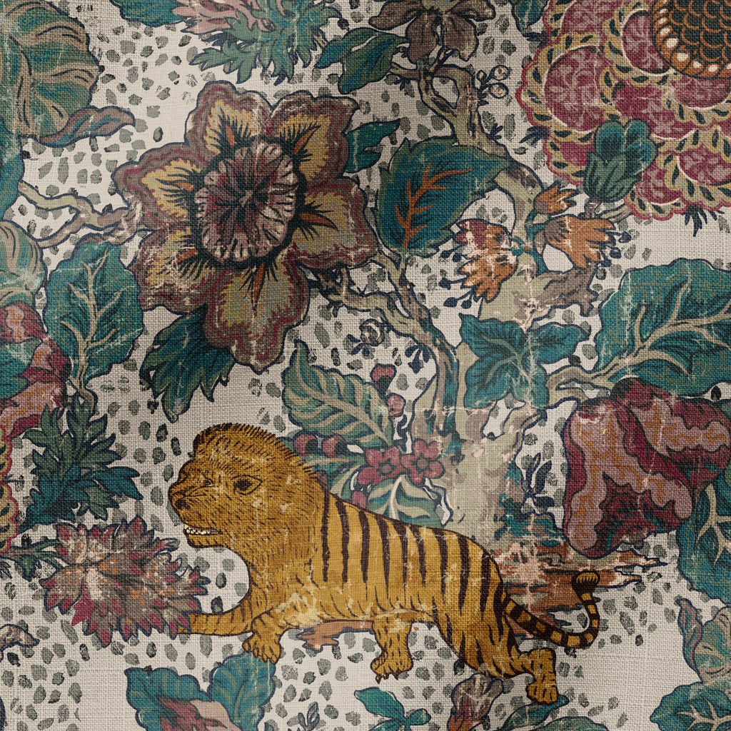 Exotic jungle print featuring tigers and lush floral elements. Perfect for bohemian decor.