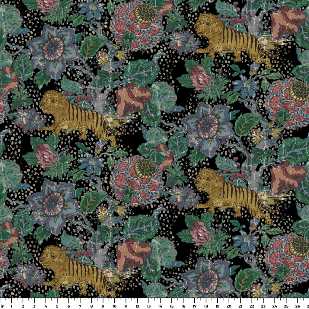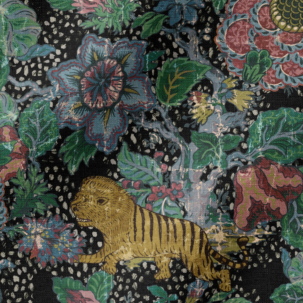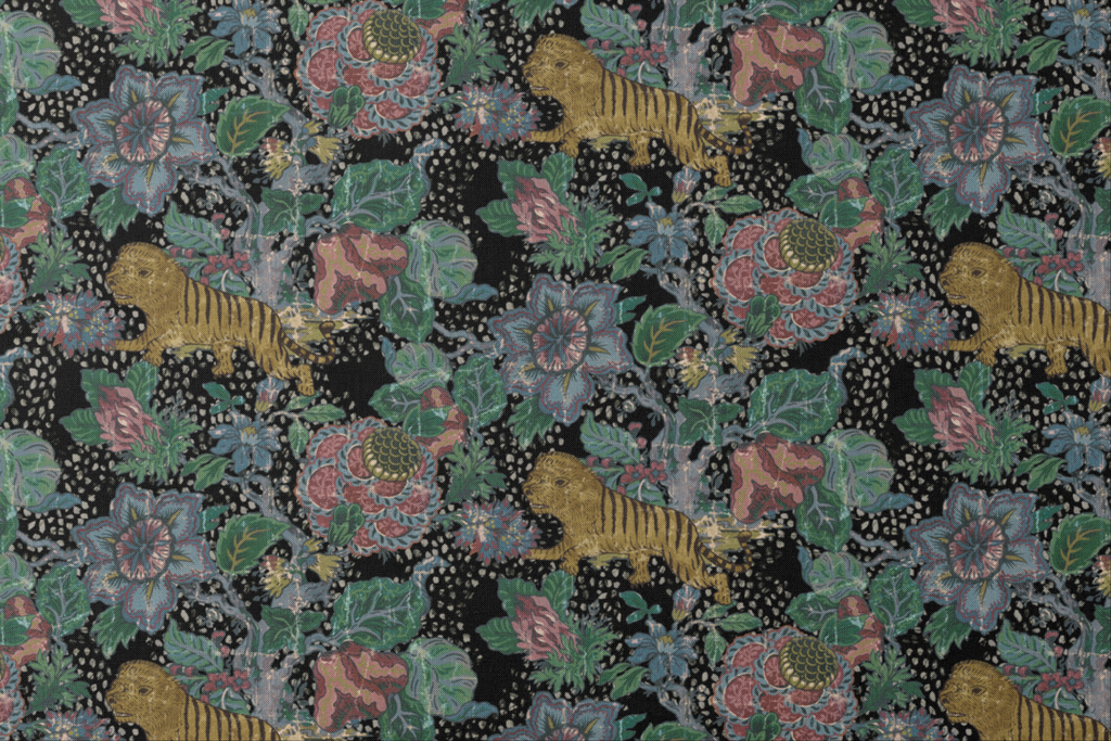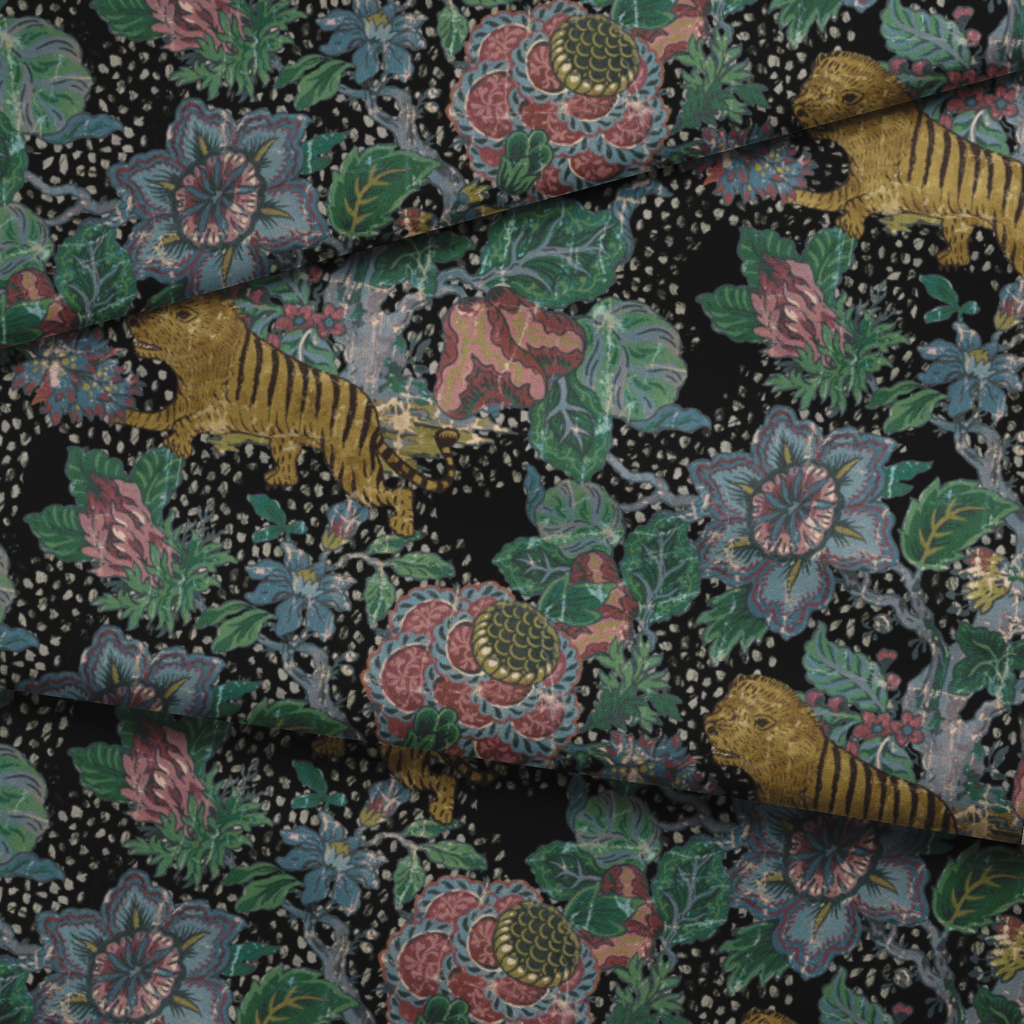 Exotic jungle print featuring tigers and lush floral elements. Perfect for bohemian decor.