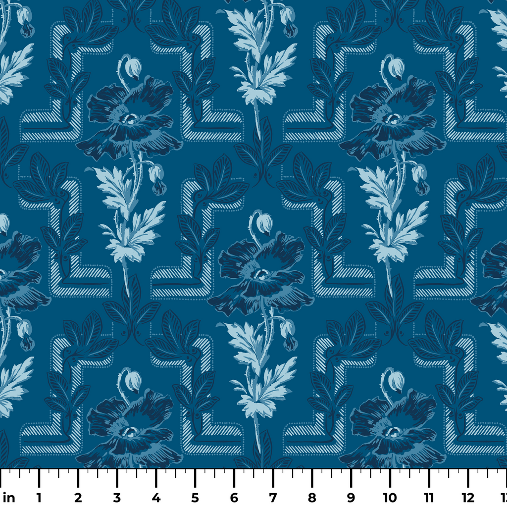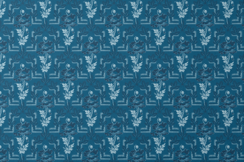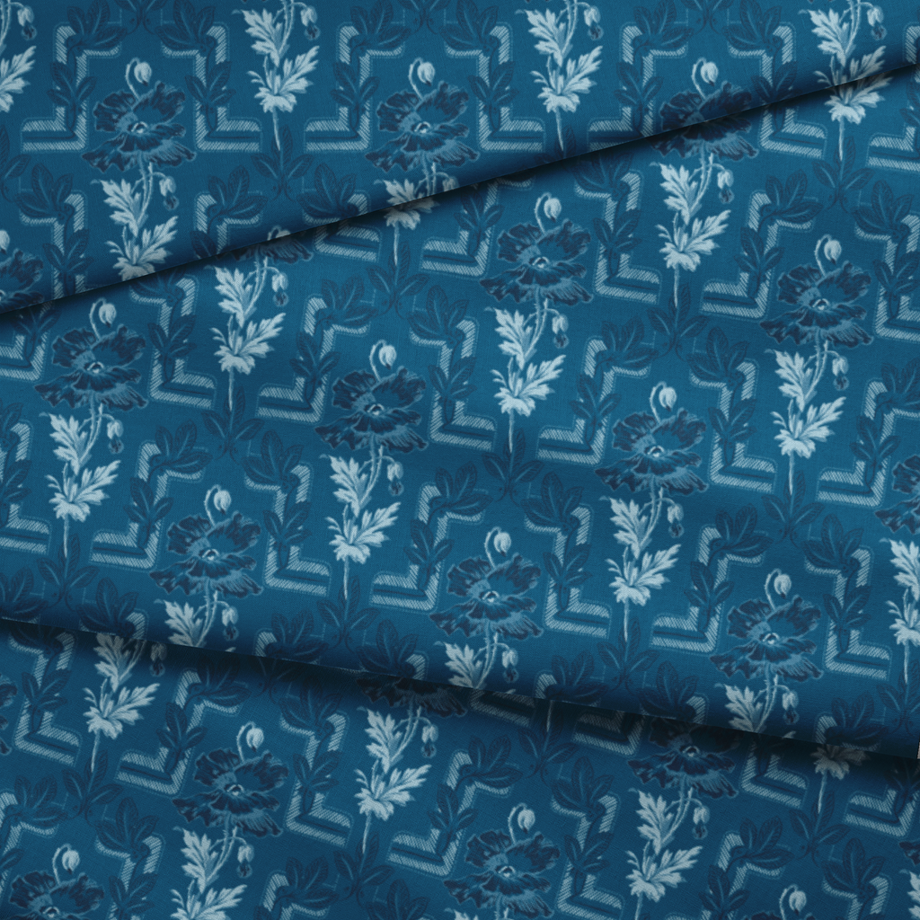 Elegant vintage floral design with delicate peonies and foliage arranged in a sophisticated geometric lattice pattern on a deep blue background.