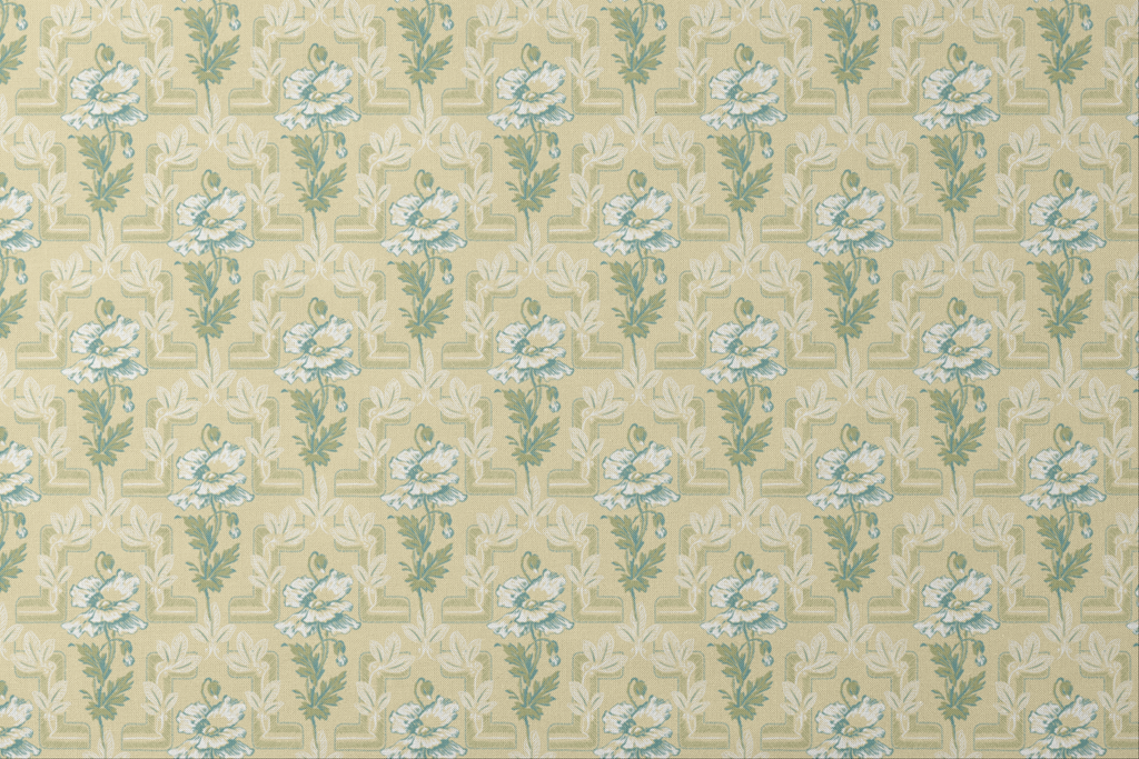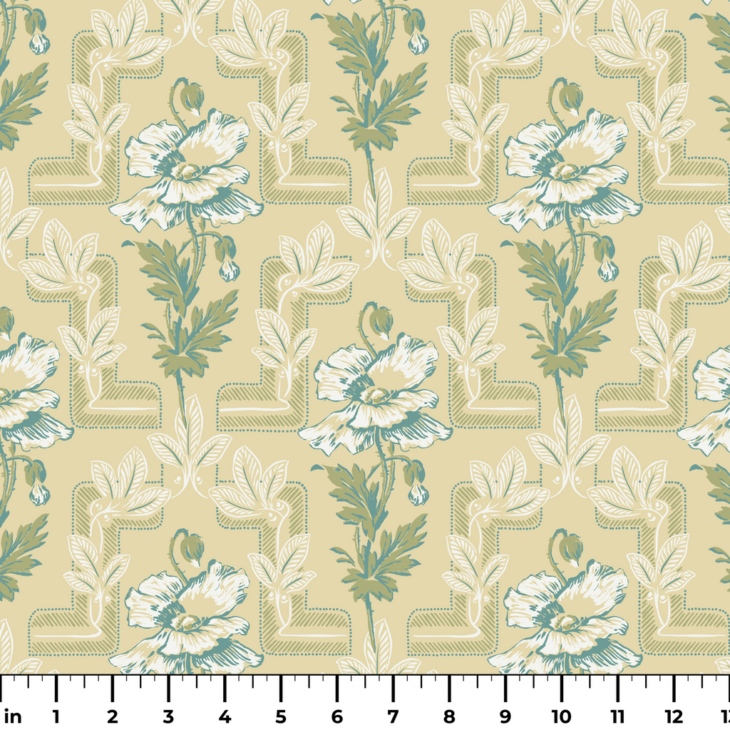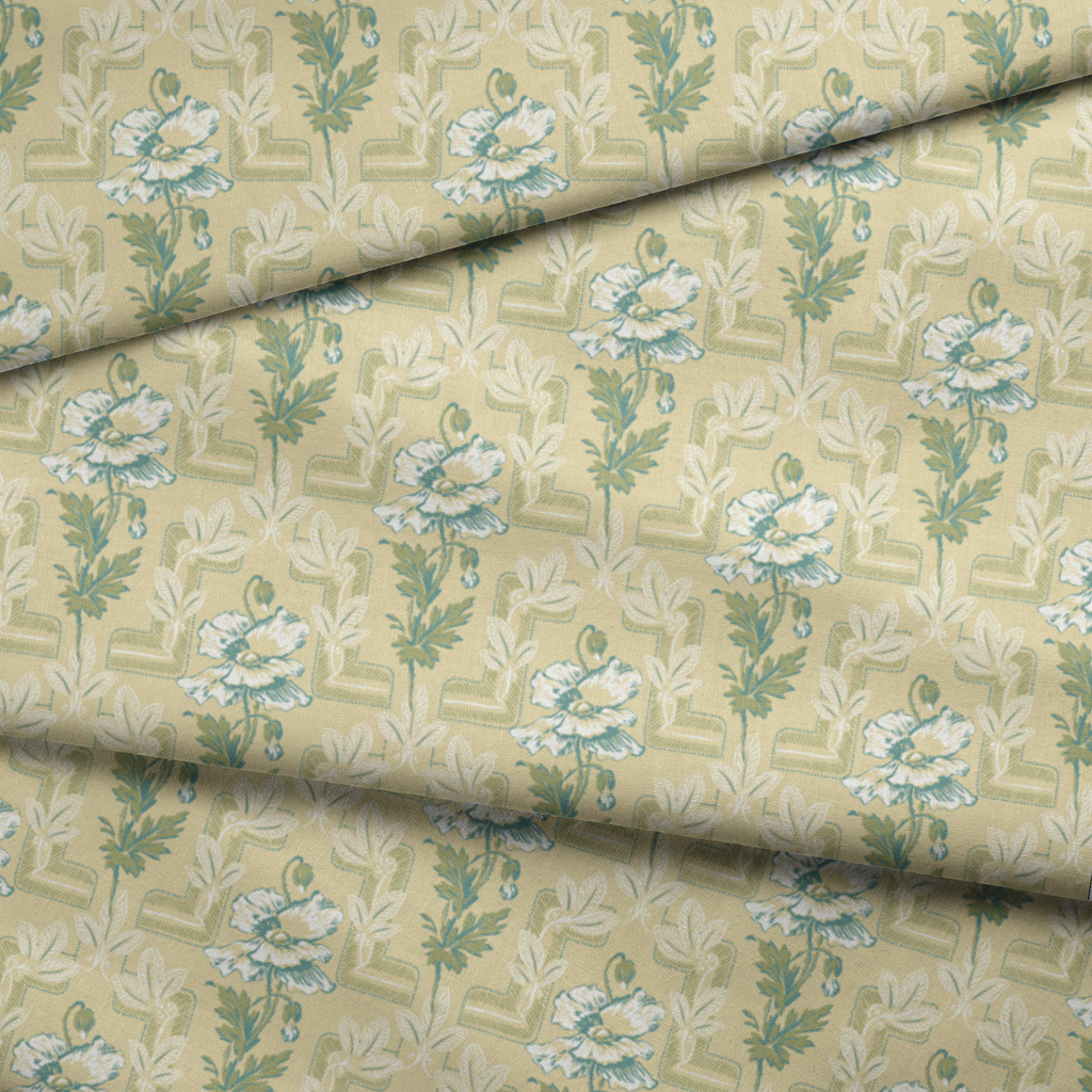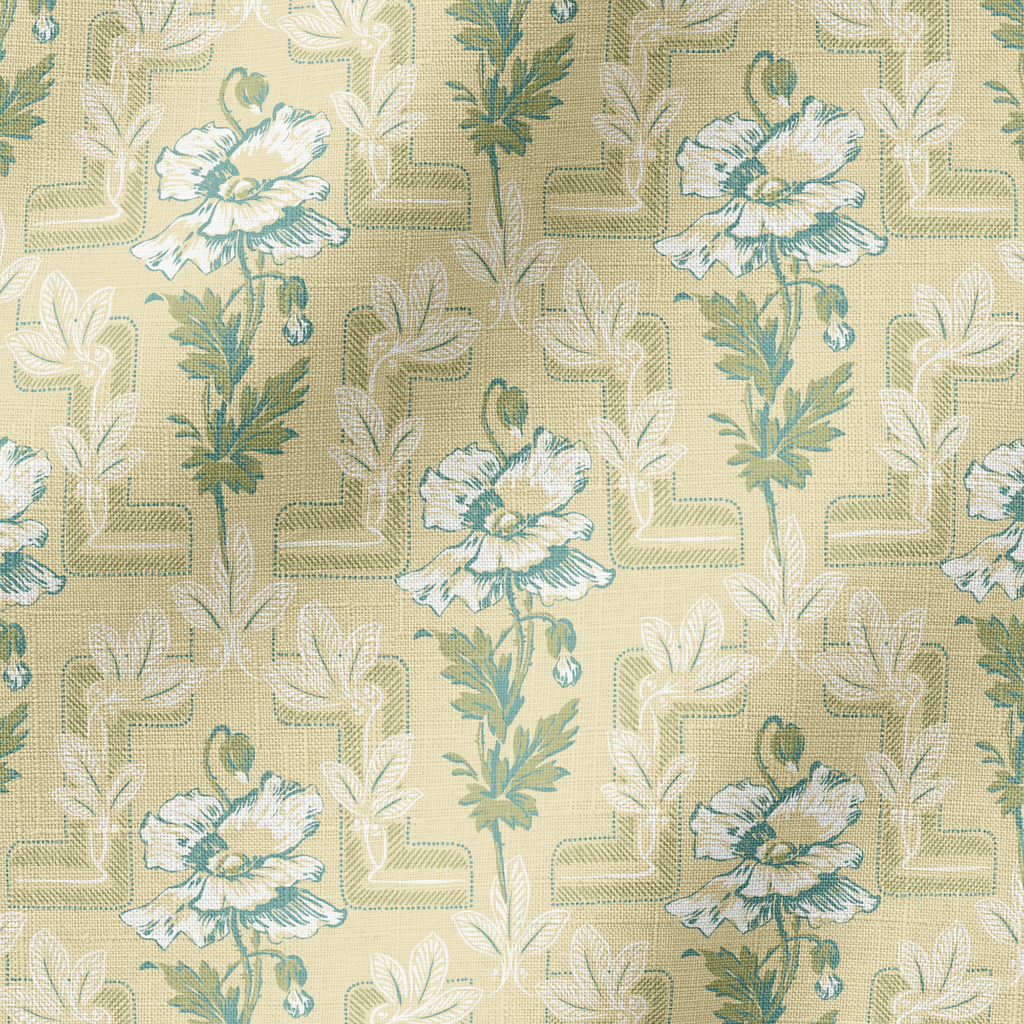 Elegant vintage floral design with delicate peonies and foliage arranged in a sophisticated geometric lattice pattern on a muted yellow background.