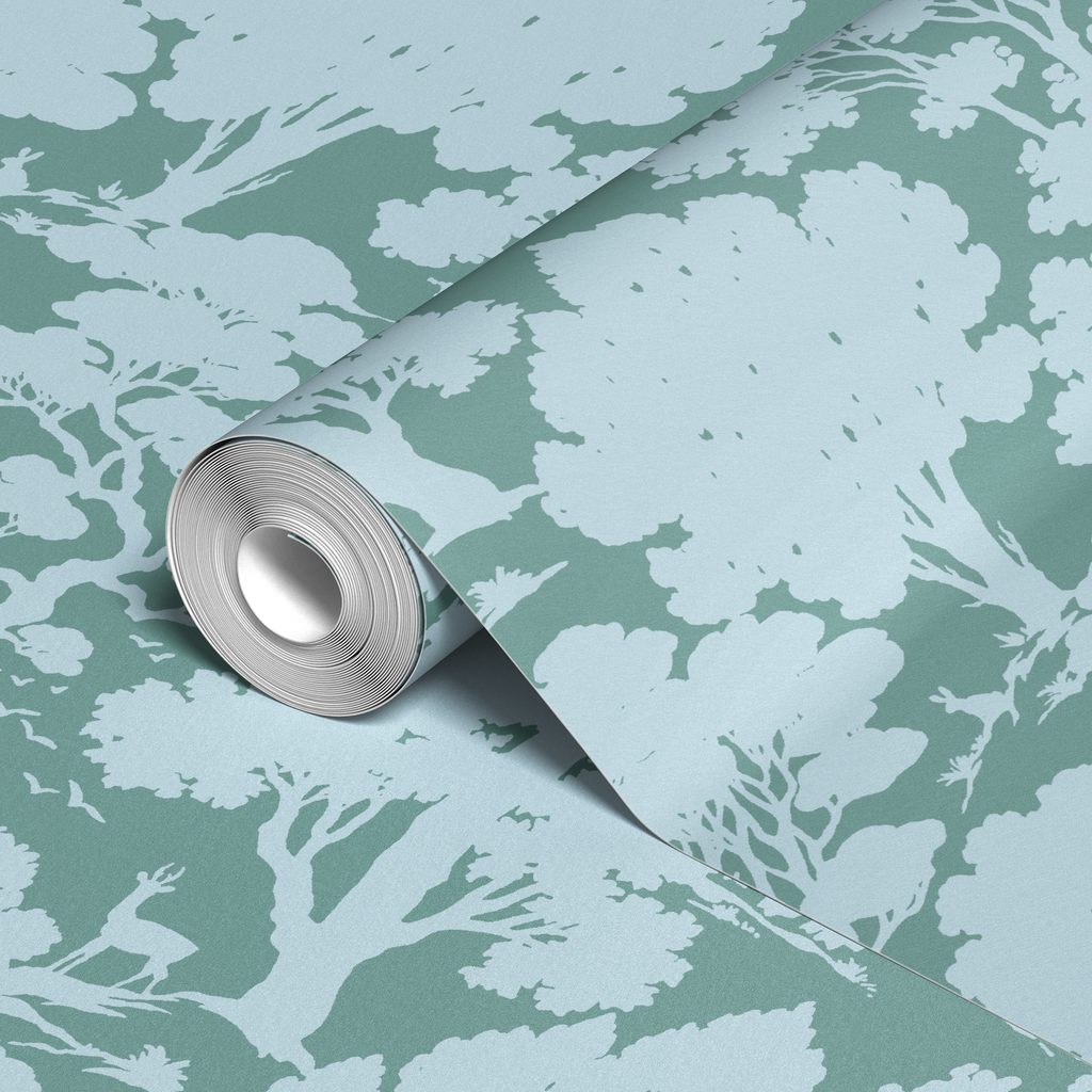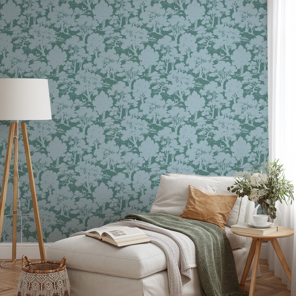 This elegant silhouette tree pattern features a serene light blue and sage green color palette. A tranquil woodland motif that brings natural beauty to home decor with its contemporary yet timeless design.