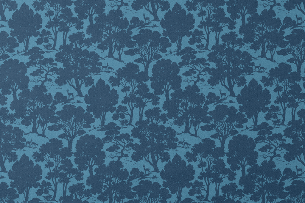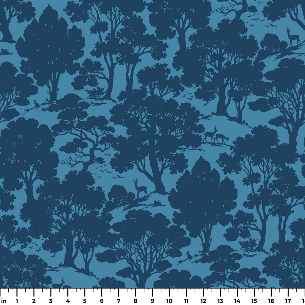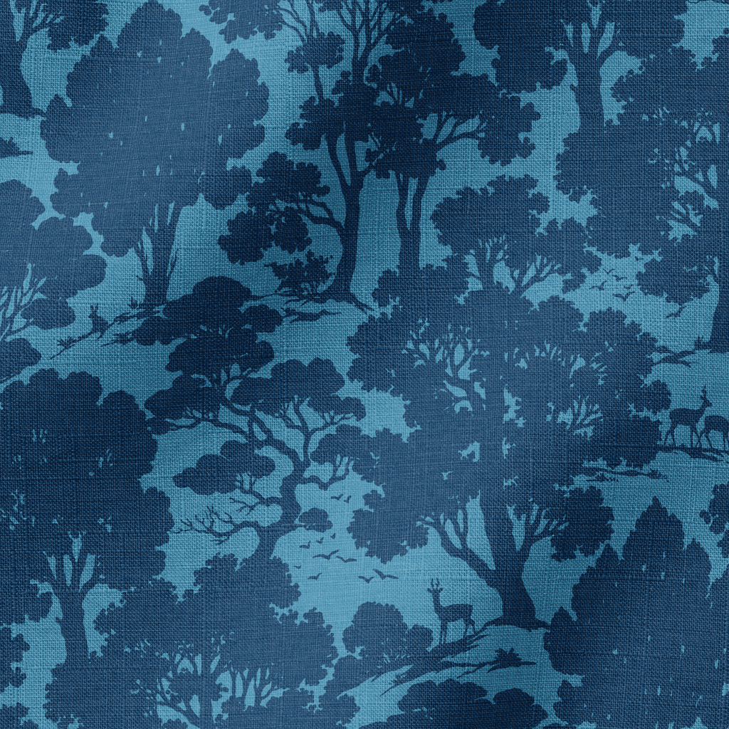 A tranquil navy blue forest silhouette design featuring layered trees and subtle wildlife forms. This atmospheric woodland pattern evokes serenity and depth, grounded in a quiet, contemporary nature aesthetic.