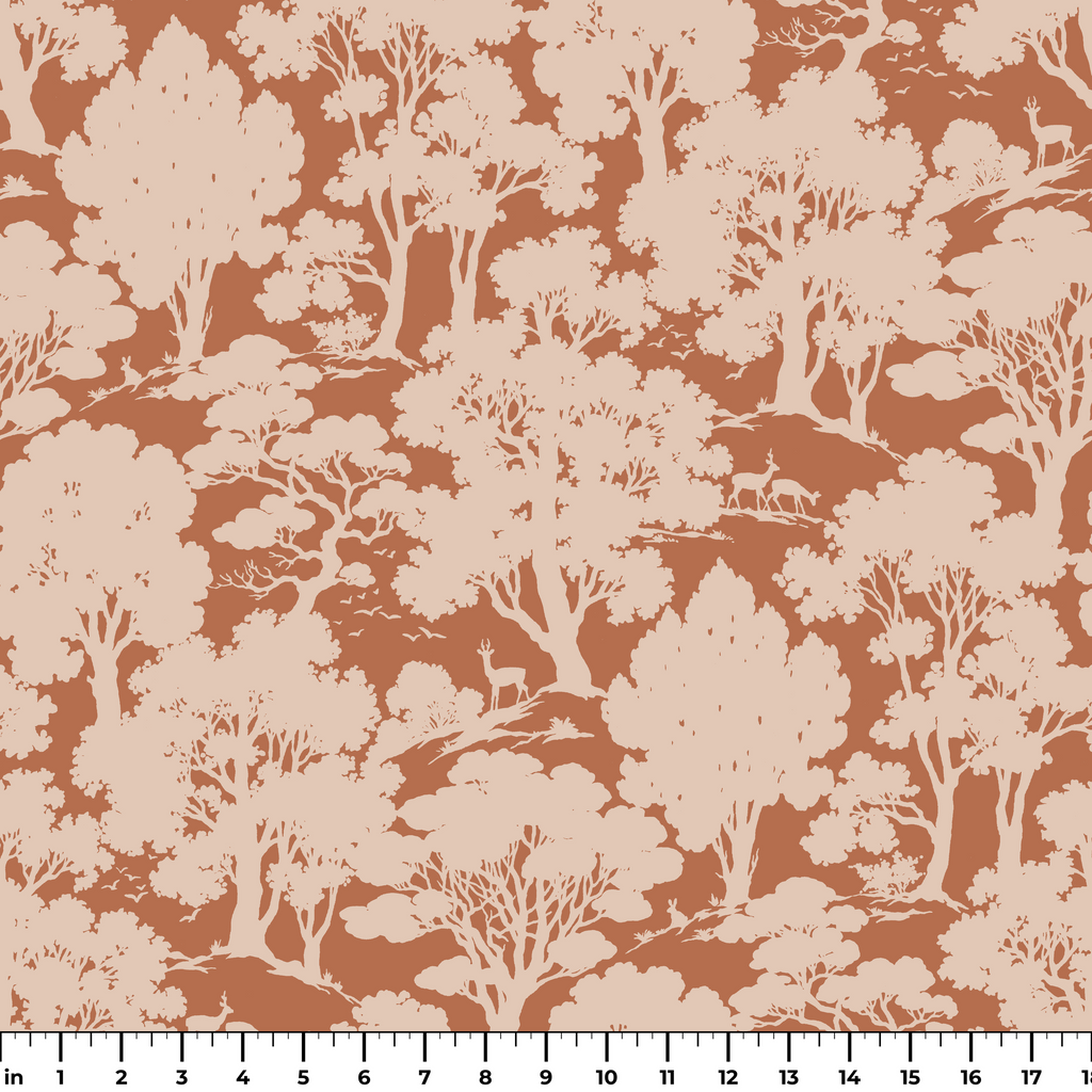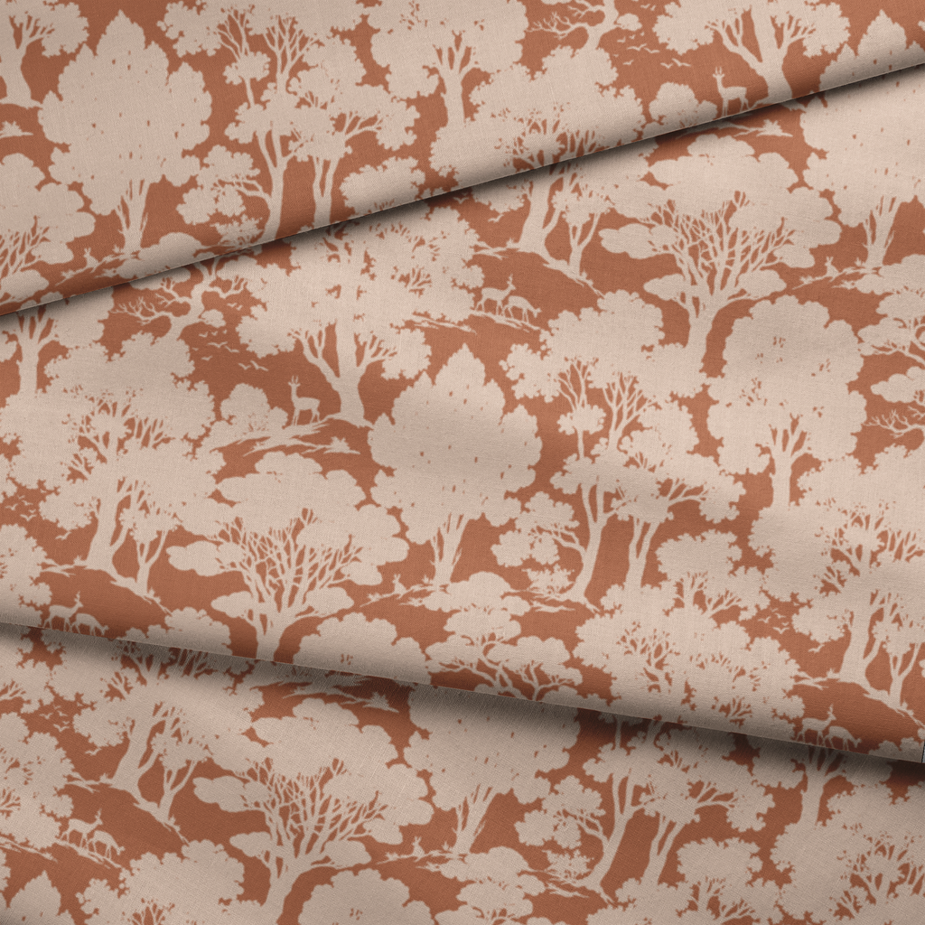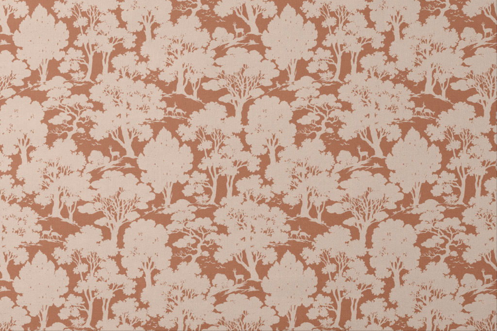 A tranquil terracotta forest silhouette design featuring layered trees and subtle wildlife forms. This atmospheric woodland pattern evokes serenity and depth, grounded in a quiet, contemporary nature aesthetic.
