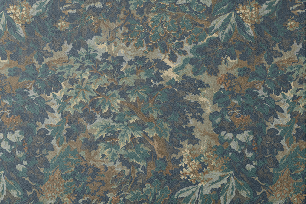 This elegant botanical design features a lush arrangement of foliage in deep teal, forest green, and gold tones, creating a sophisticated heritage-inspired pattern perfect for a traditional home vibe.