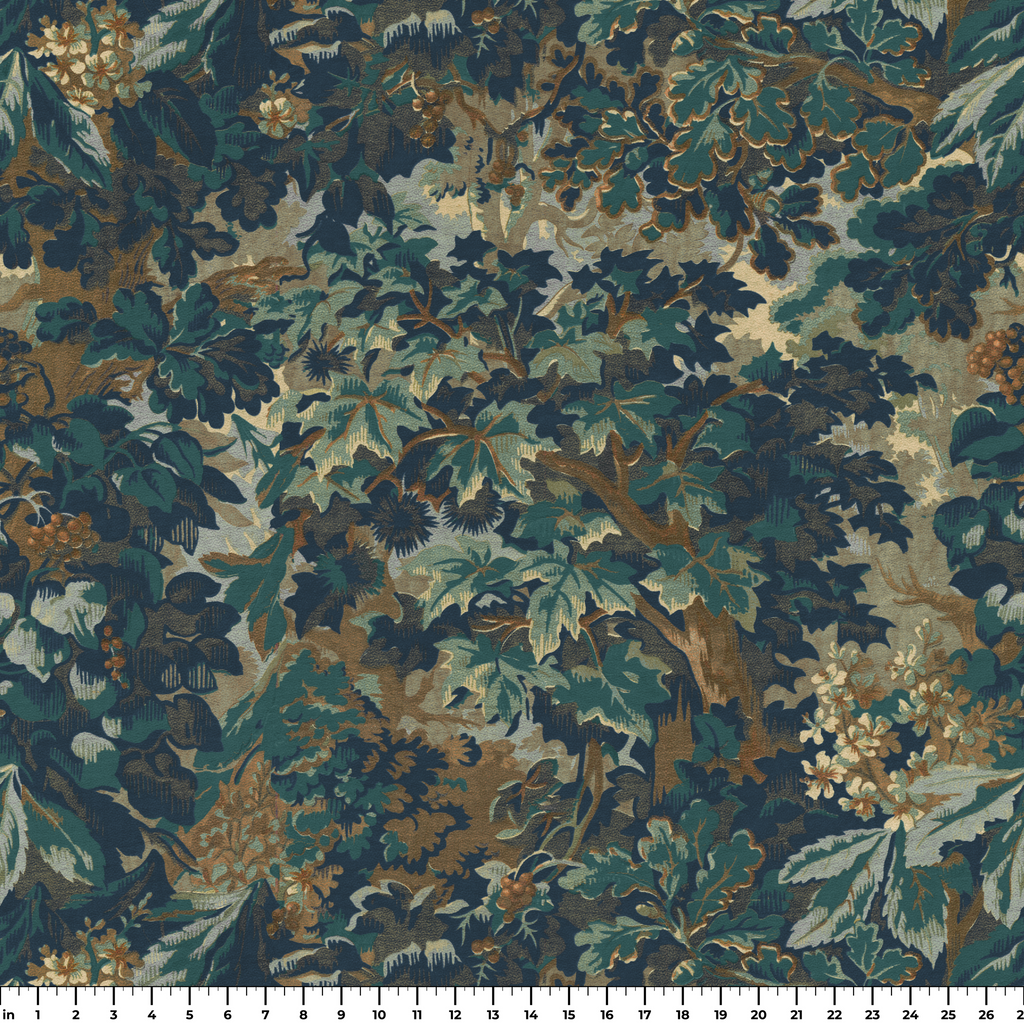 Elegante papel tapiz botánico en tonos profundos de verde azulado y ocre dorado, con exuberantes hojas y flores silvestres entrelazadas en un patrón naturalista clásico.