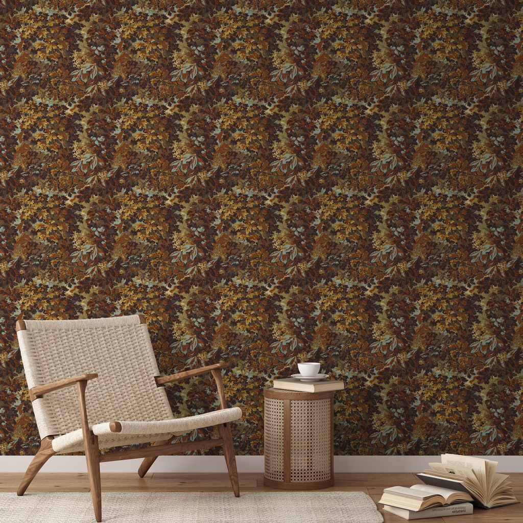This elegant botanical design features a lush arrangement of foliage in brown, orange, and red tones, creating a sophisticated heritage-inspired pattern perfect for a traditional home vibe.