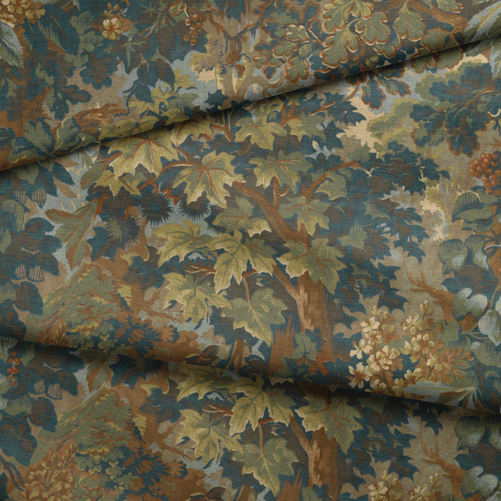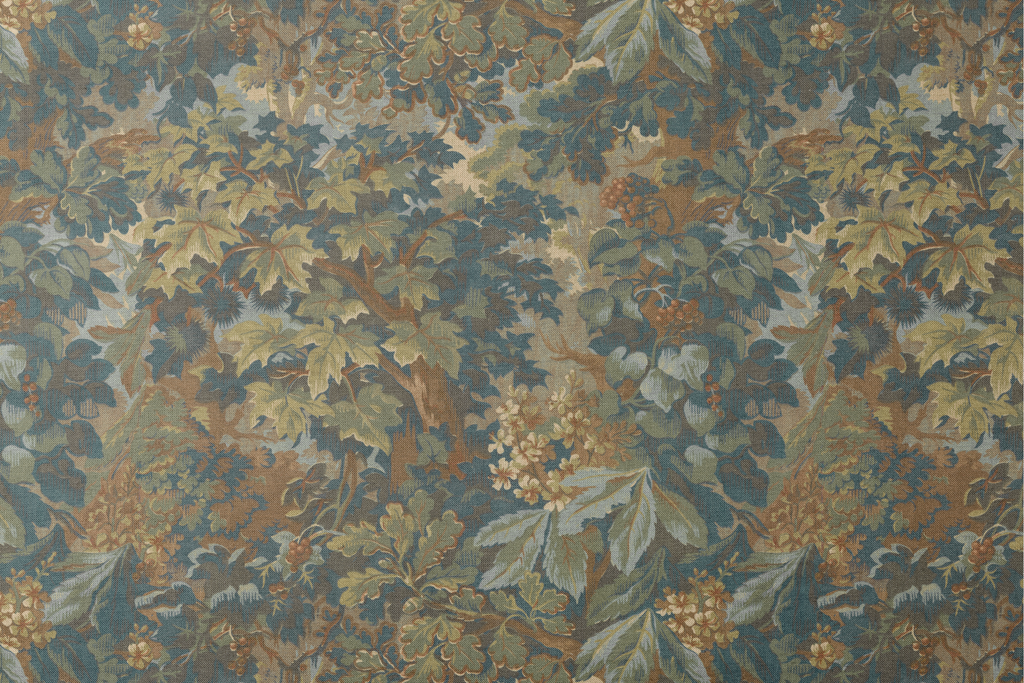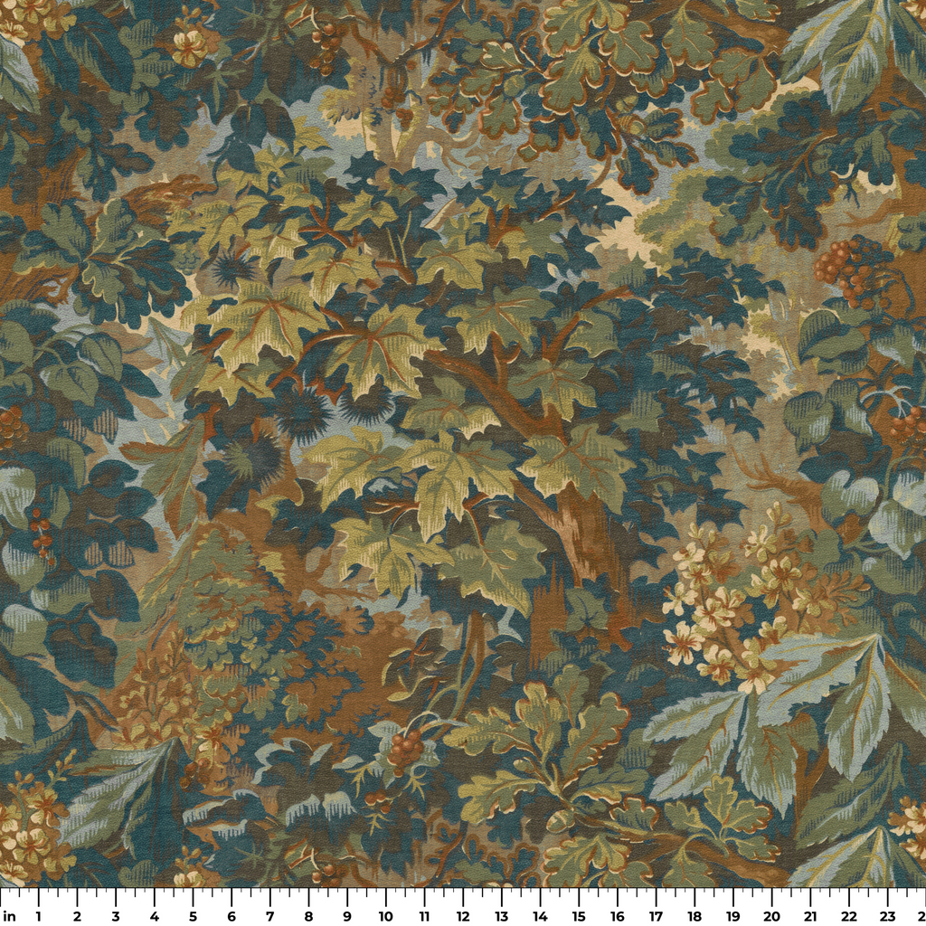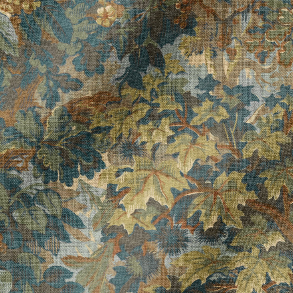 This elegant botanical design features a lush arrangement of foliage in green, teal, and yellow tones, creating a sophisticated heritage-inspired pattern perfect for a traditional home vibe.