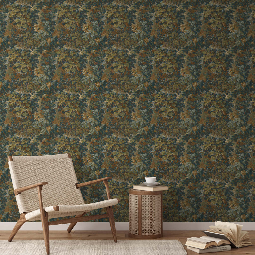 This elegant botanical design features a lush arrangement of foliage in green, teal, and yellow tones, creating a sophisticated heritage-inspired pattern perfect for a traditional home vibe.
