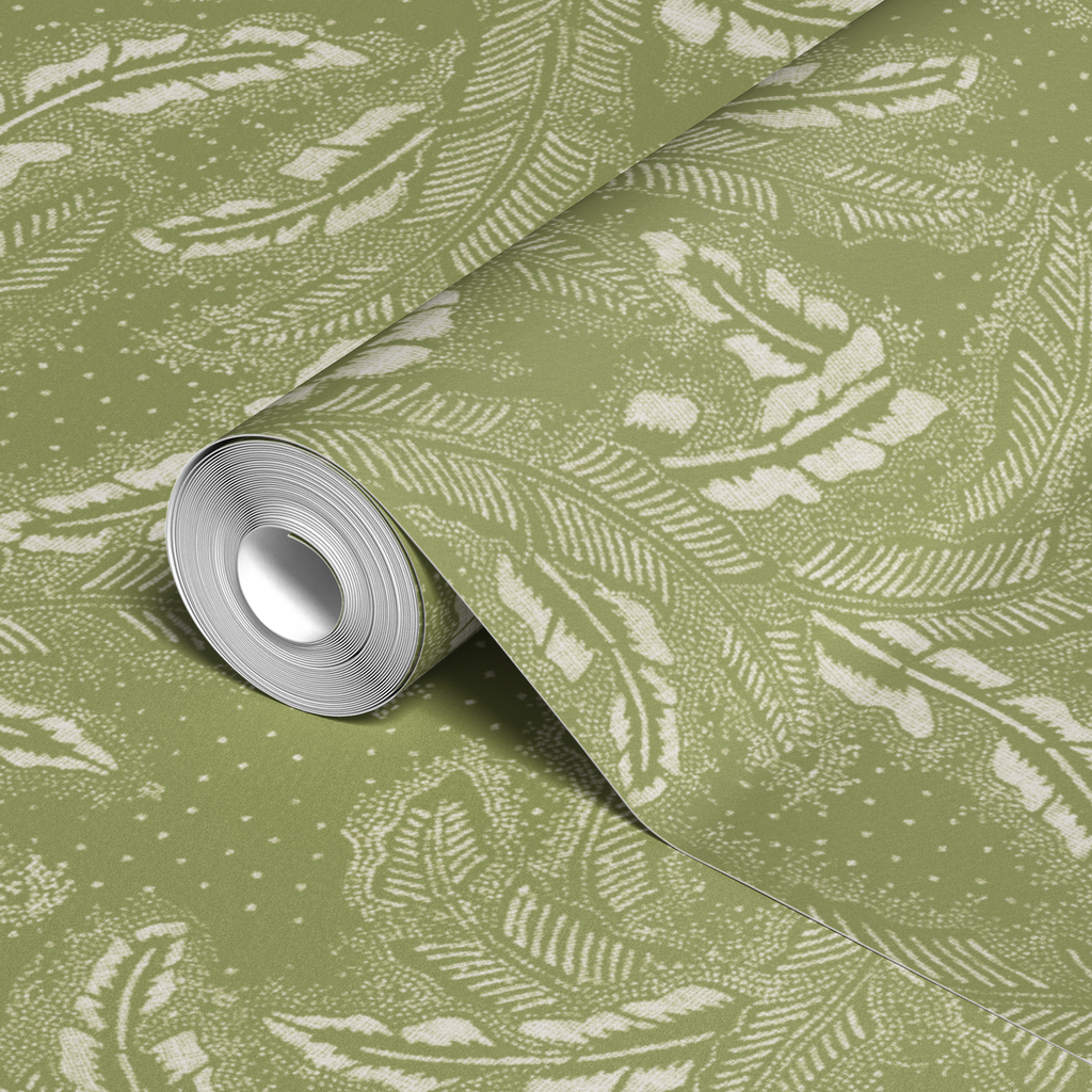 Elegant sage green botanical pattern featuring delicate flowing leaves and curved elements in a textured, nature-inspired design perfect for a sophisticated vibe for any space.