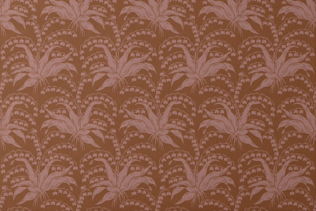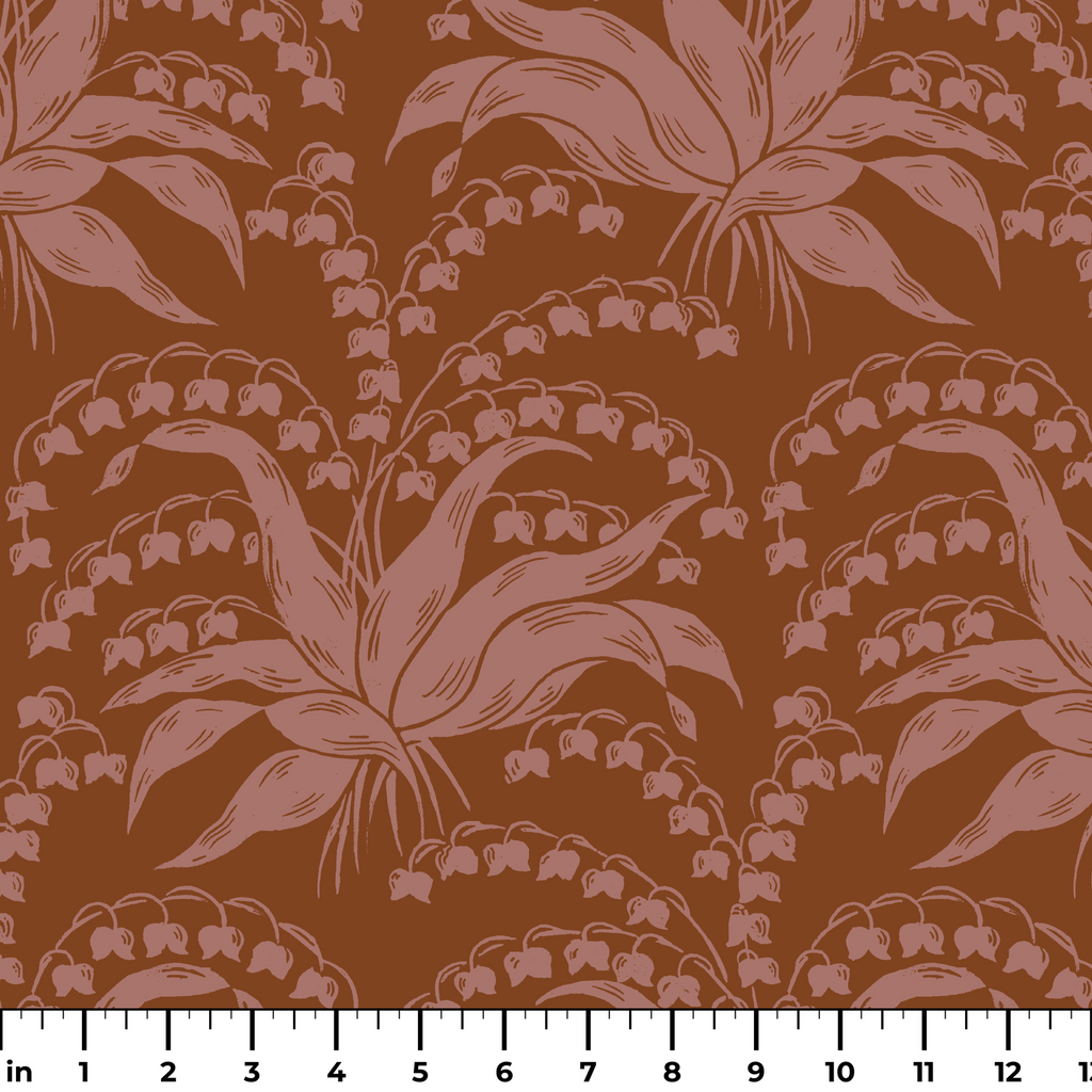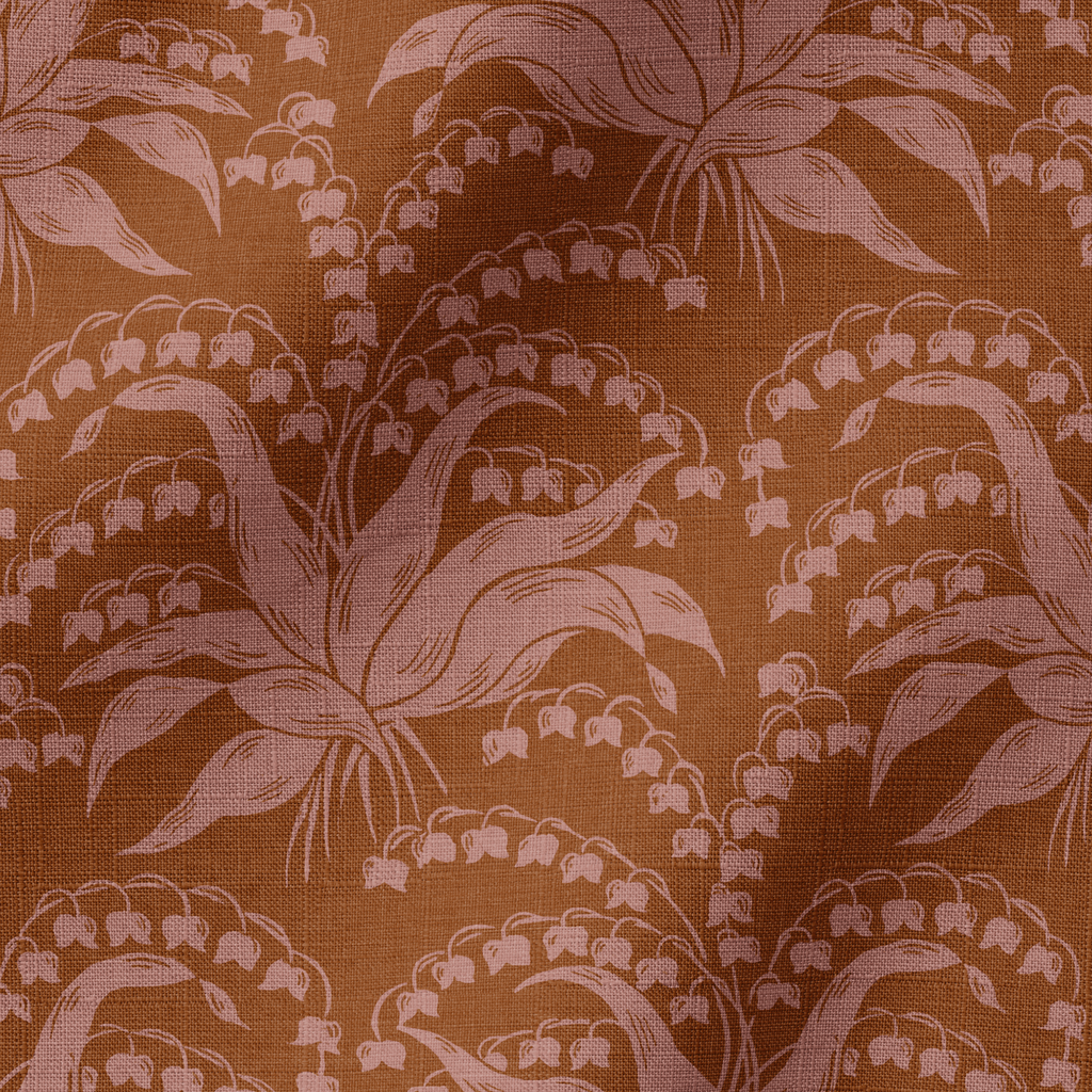 Elegant lily of the valley botanical pattern on a tranquil deep orange background, featuring delicate white blooms and graceful leaves in a timeless, heritage-inspired design.