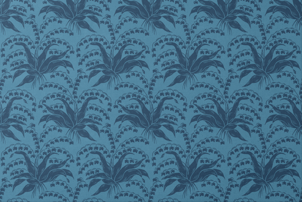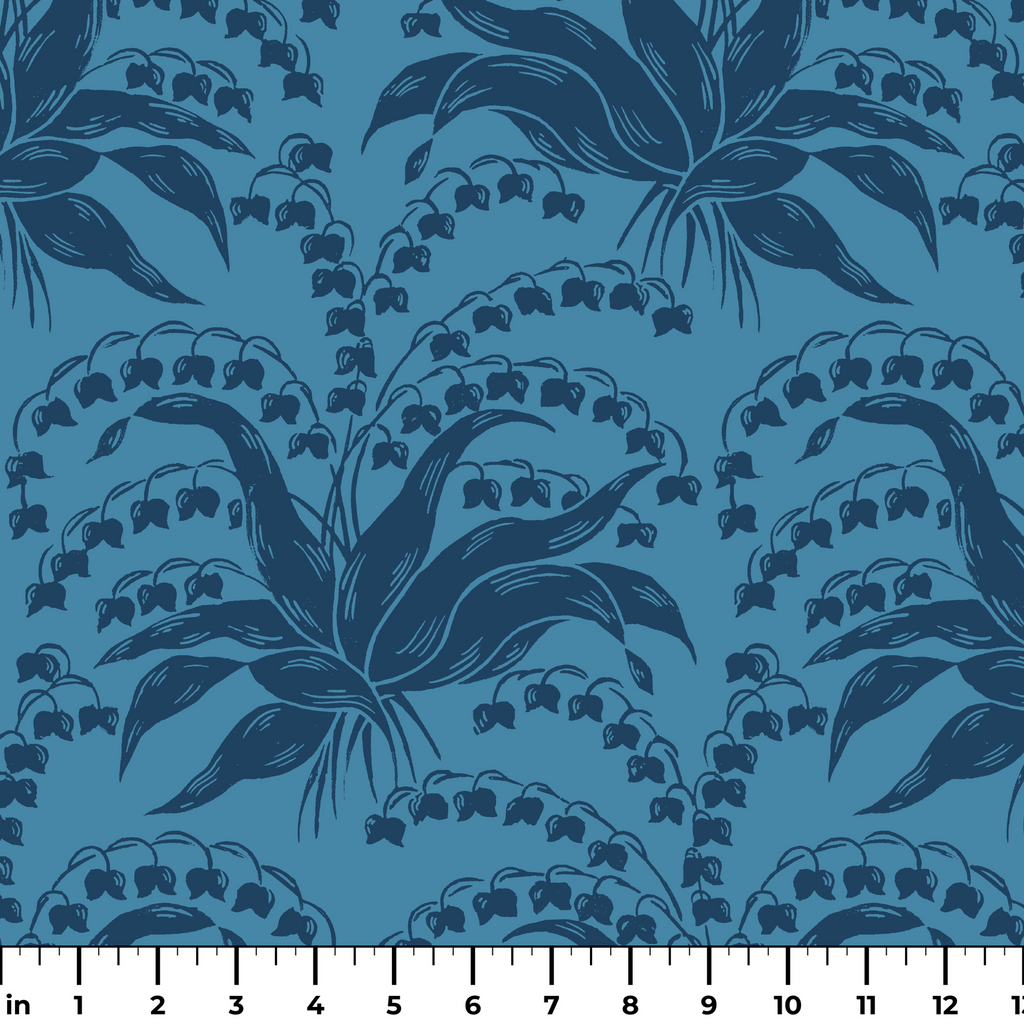 Elegant lily of the valley botanical pattern on a tranquil blue background, featuring delicate white blooms and graceful leaves in a timeless, heritage-inspired design.