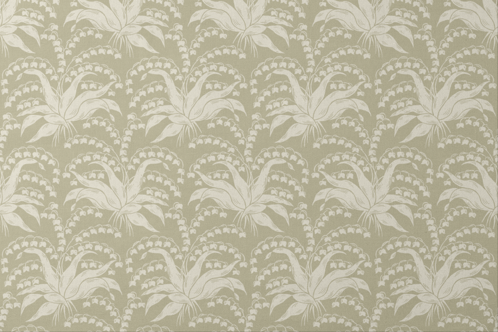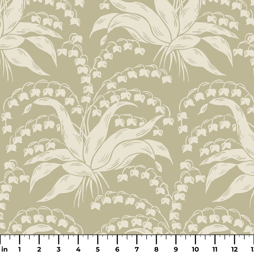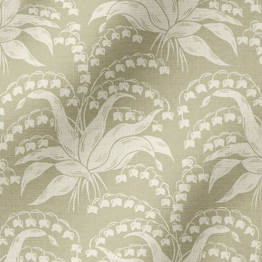 Elegant lily of the valley botanical pattern on a tranquil sage green background, featuring delicate white blooms and graceful leaves in a timeless, heritage-inspired design.