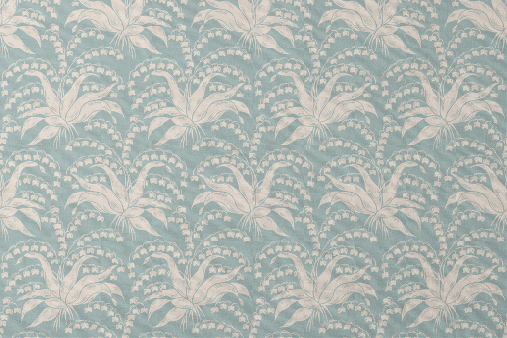 Elegant lily of the valley botanical pattern on a tranquil blue-green background, featuring delicate white blooms and graceful leaves in a timeless, heritage-inspired design.