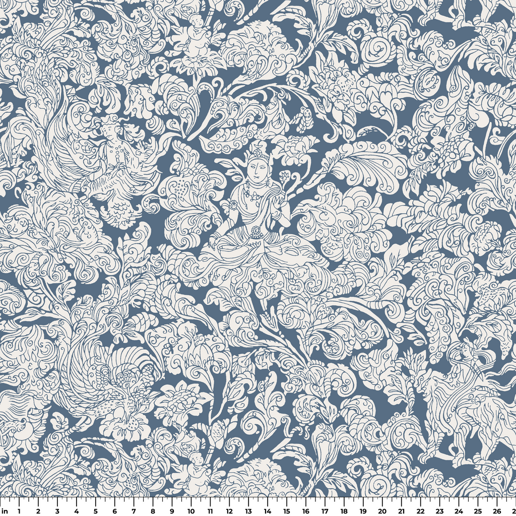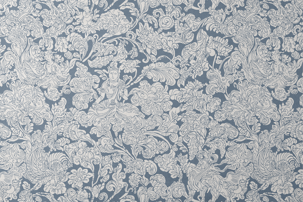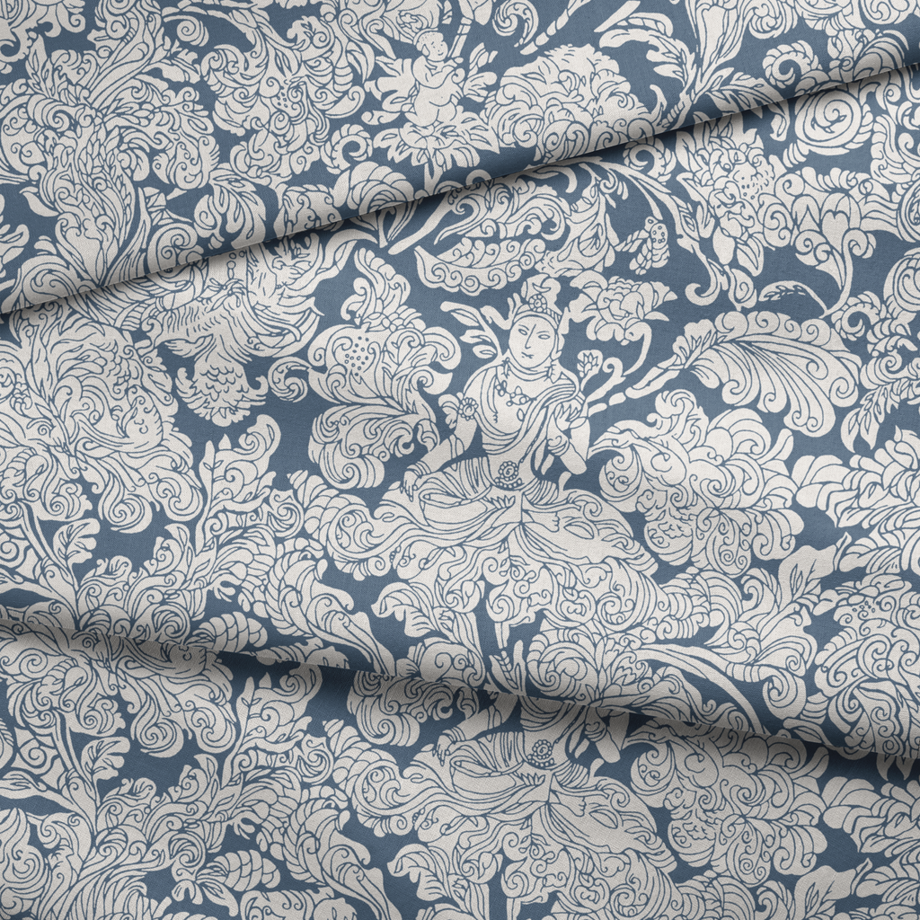 Elegant blue and white eastern floral damask pattern with intricate swirls and flowing lines, featuring a traditional vintage aesthetic perfect for use in any space.