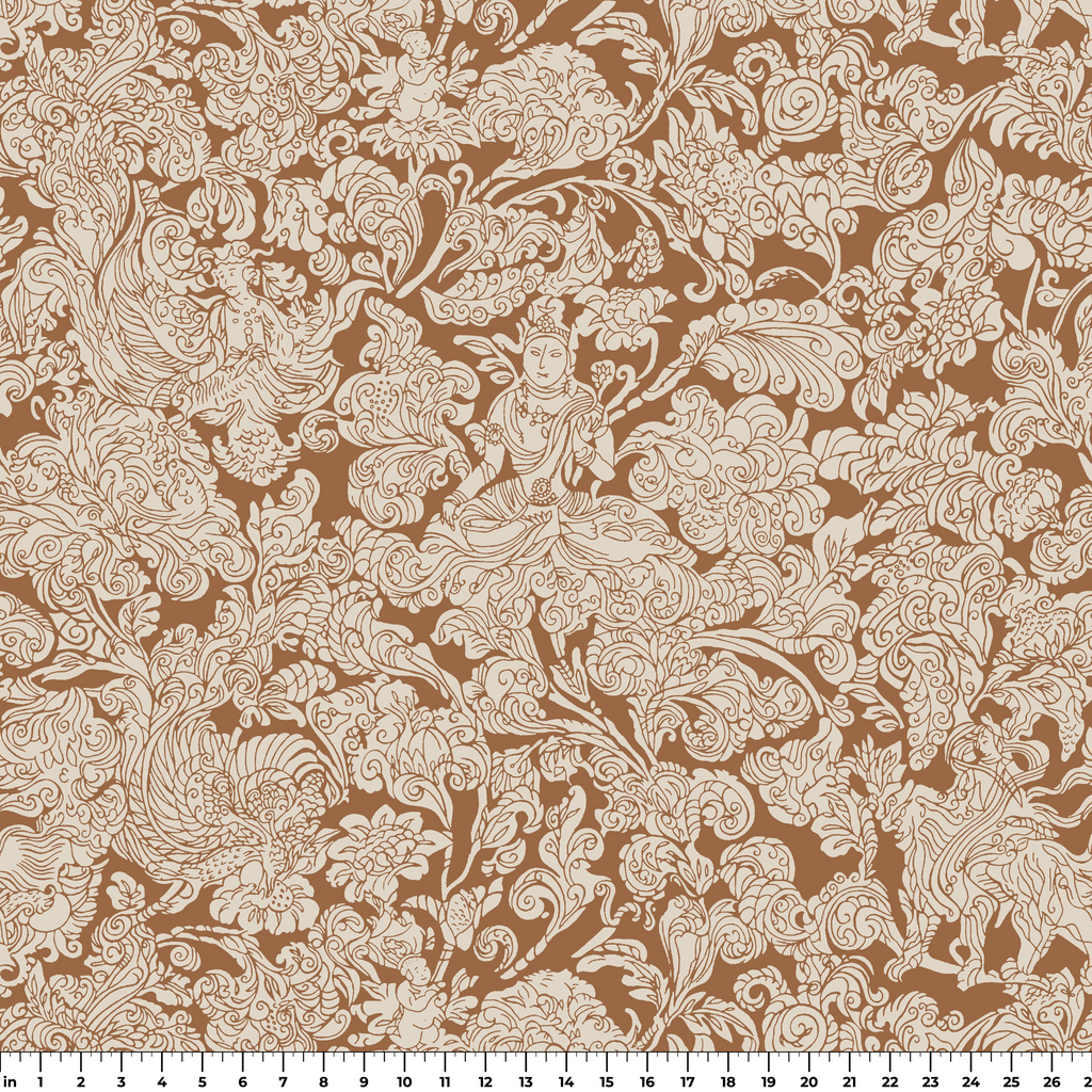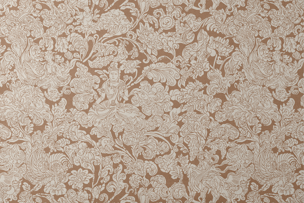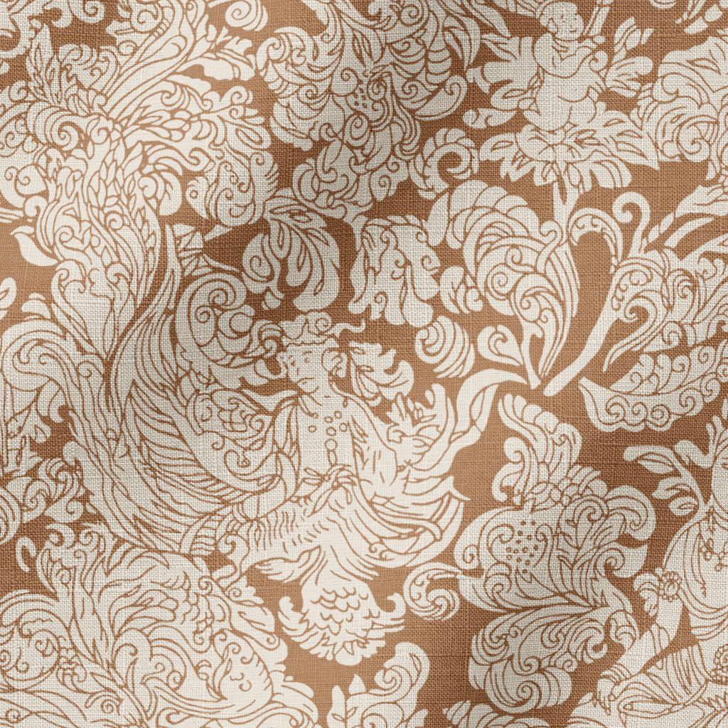 Elegant brown and cream eastern floral damask pattern with intricate swirls and flowing lines, featuring a traditional vintage aesthetic perfect for use in any space.