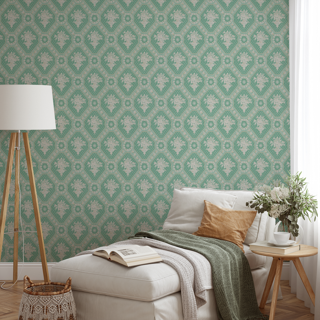 Elegant vintage floral damask wallpaper in soft mint green and cream featuring decorative bouquet motifs and ornate scrollwork borders in a traditional diamond pattern.